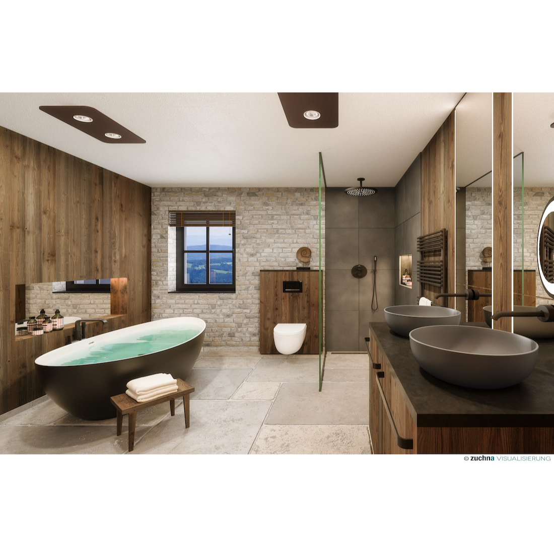 Im Erdgeschoss erwarten Sie zwei geräumige Schlafzimmer, die beide mit einem komfortablen Doppelbett und einem Flachbildschirm versehen sind. Von beiden Schlafzimmern gelangt man auf die große Terrasse, von der man auf die Berge, ins Tal oder in den Wald blicken kann. Das Badezimmer sucht seinesgleichen, in dem eine freistehende Badewanne, eine ebenerdige Regendusche und eine private Sauna zum Entspannen einlädt.