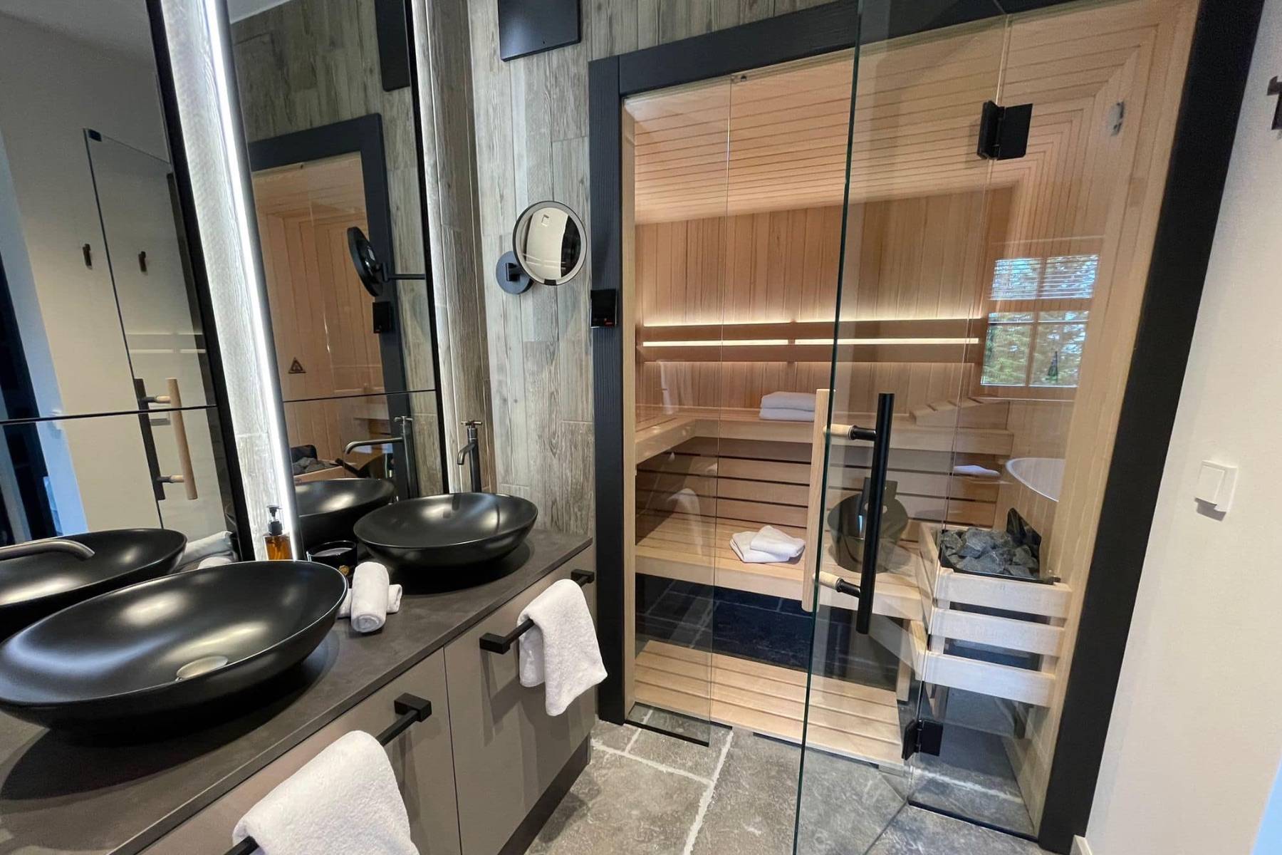 Im Erdgeschoss erwarten Sie zwei geräumige Schlafzimmer, die beide mit einem komfortablen Doppelbett und einem Flachbildschirm versehen sind. Von beiden Schlafzimmern gelangt man auf die große Terrasse, von der man auf die Berge, ins Tal oder in den Wald blicken kann. Das Badezimmer sucht seinesgleichen, in dem eine freistehende Badewanne, eine ebenerdige Regendusche und eine private Sauna zum Entspannen einlädt. Der Blick aus dem Fenster entschleunigt und entschädigt für die harten Arbeitstage.