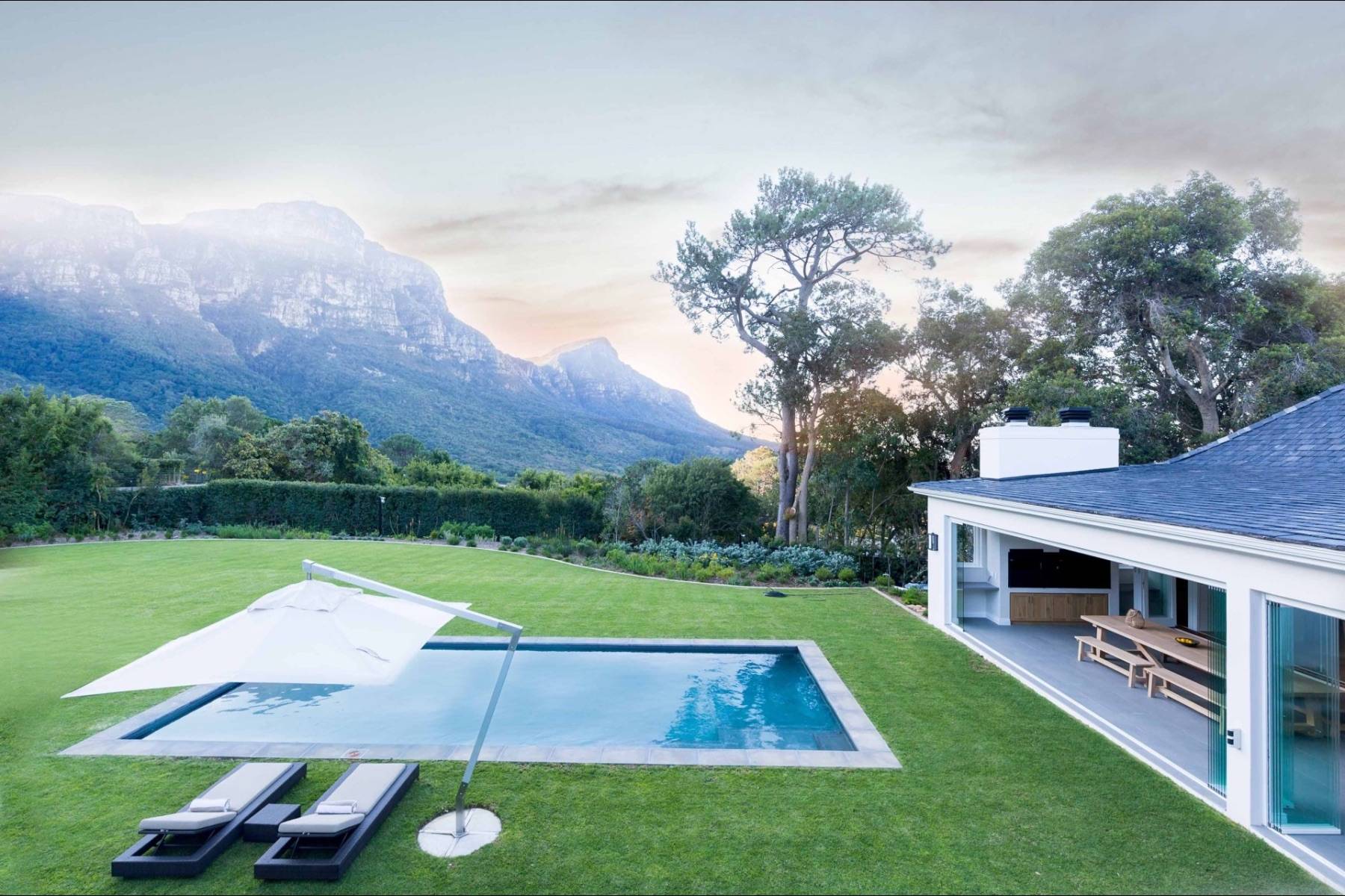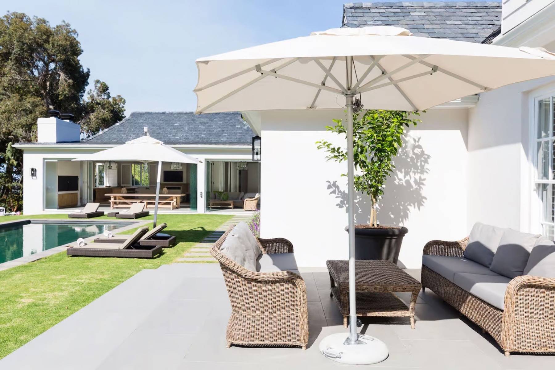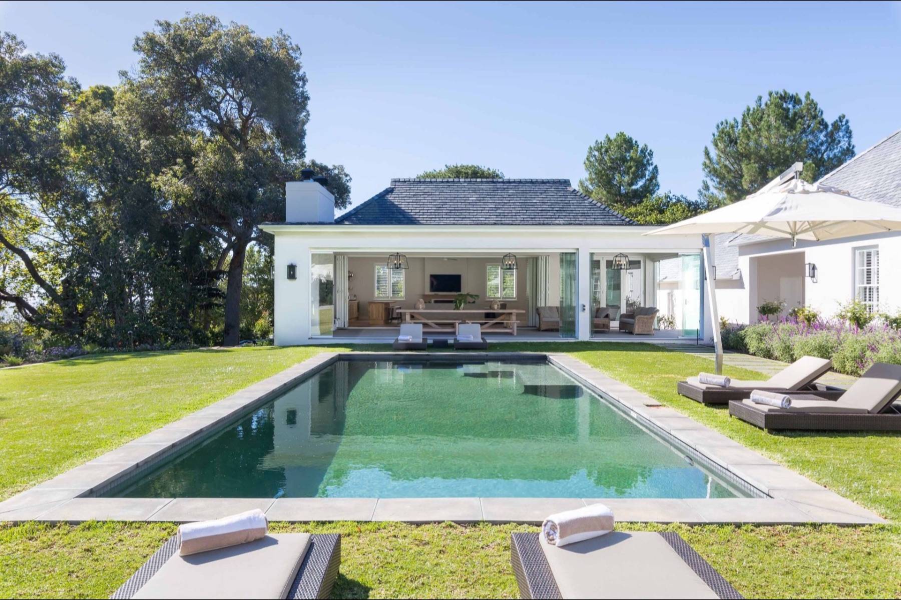 Das Poolhaus verfügt über einen eigenen Wohnbereich, der neben einem Wohnzimmer auch eine Küchentheke und einen Essbereich enthält. Große Fensterelemente lassen sich vollständig öffnen und ermöglichen einen direkten Zugang zum wunderschönen Garten und dem Pool.