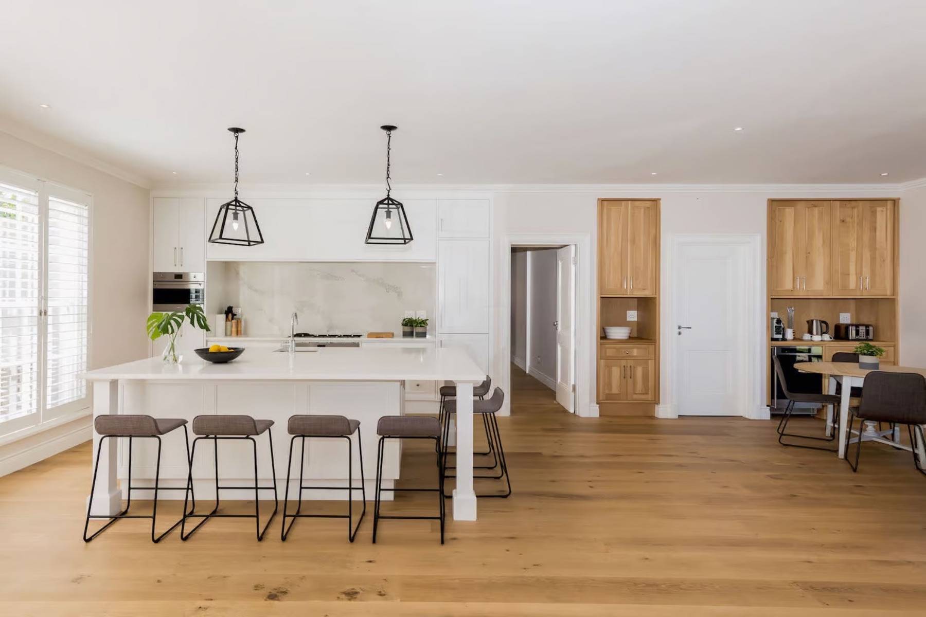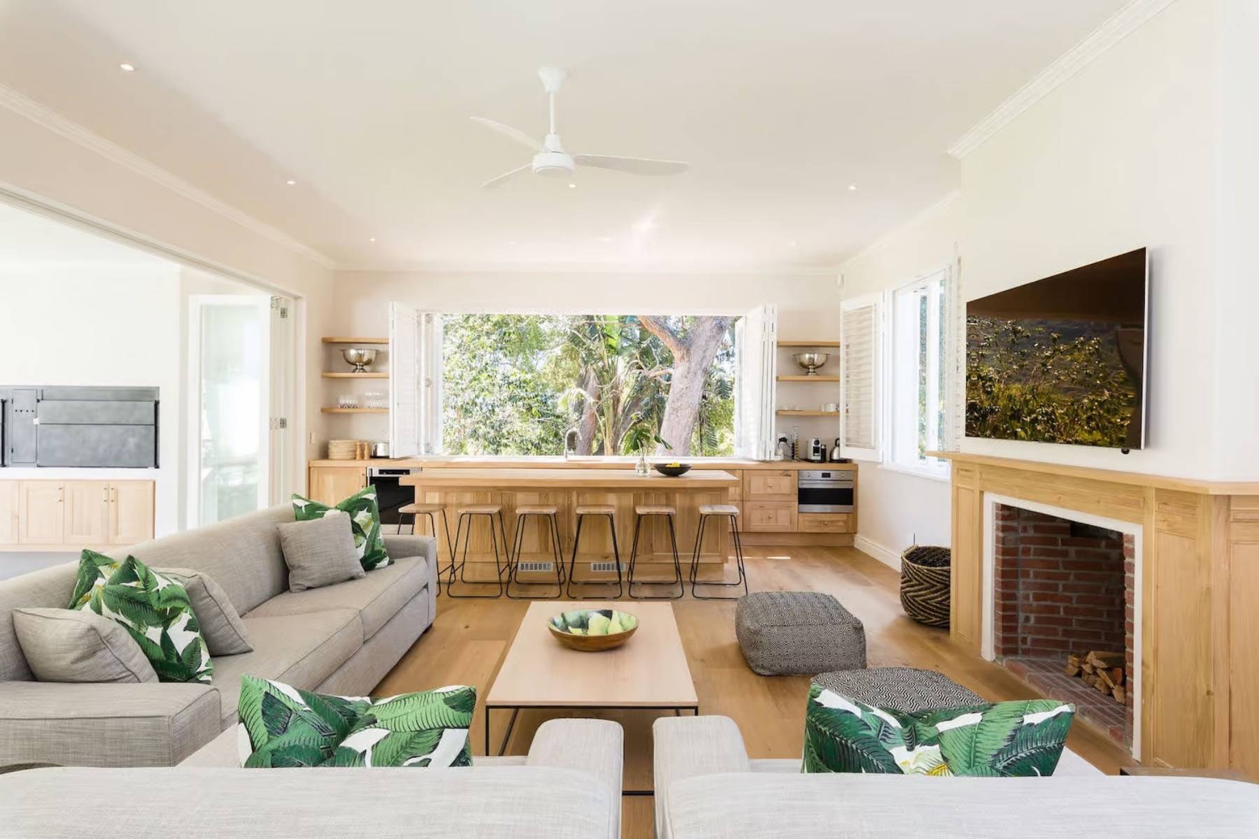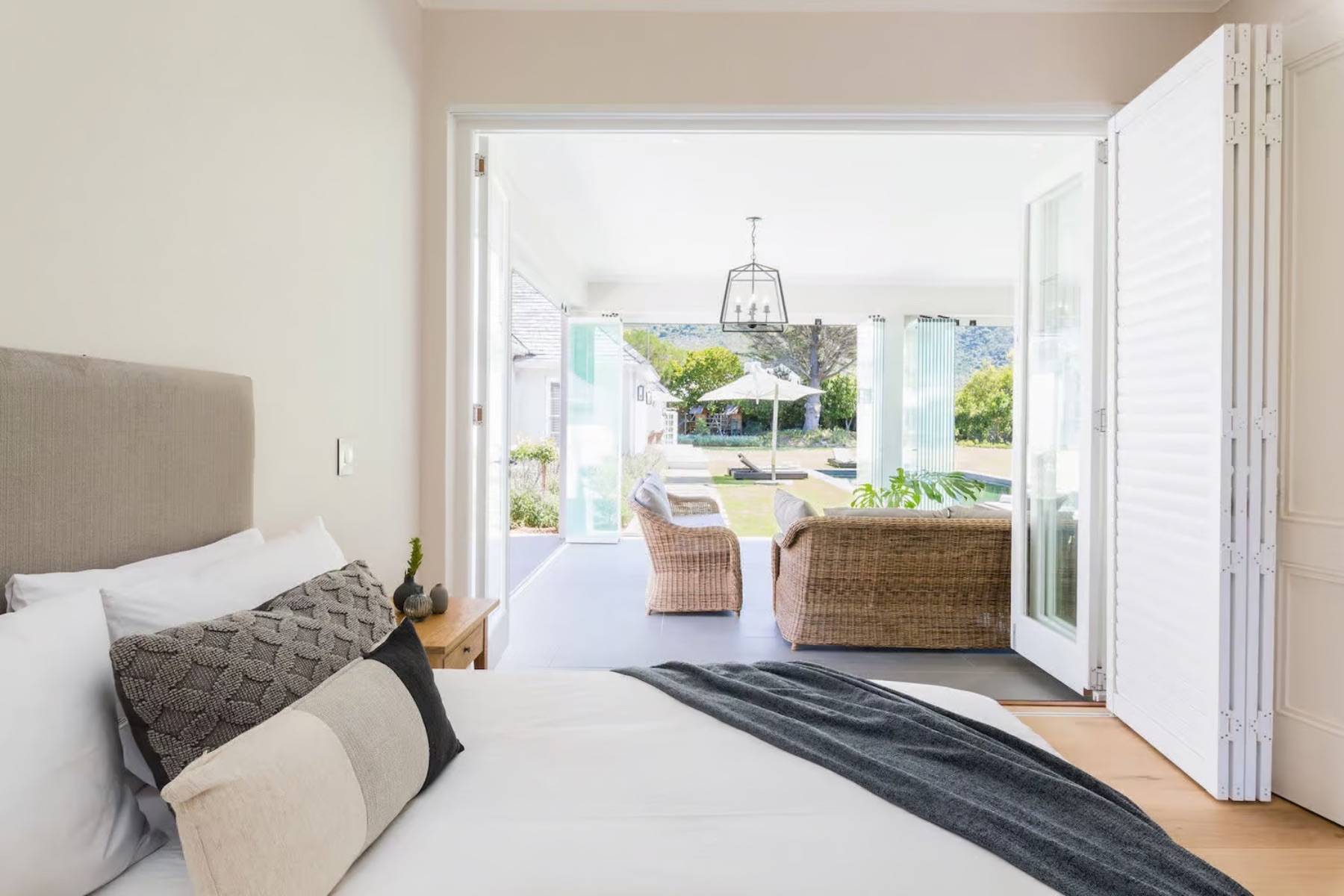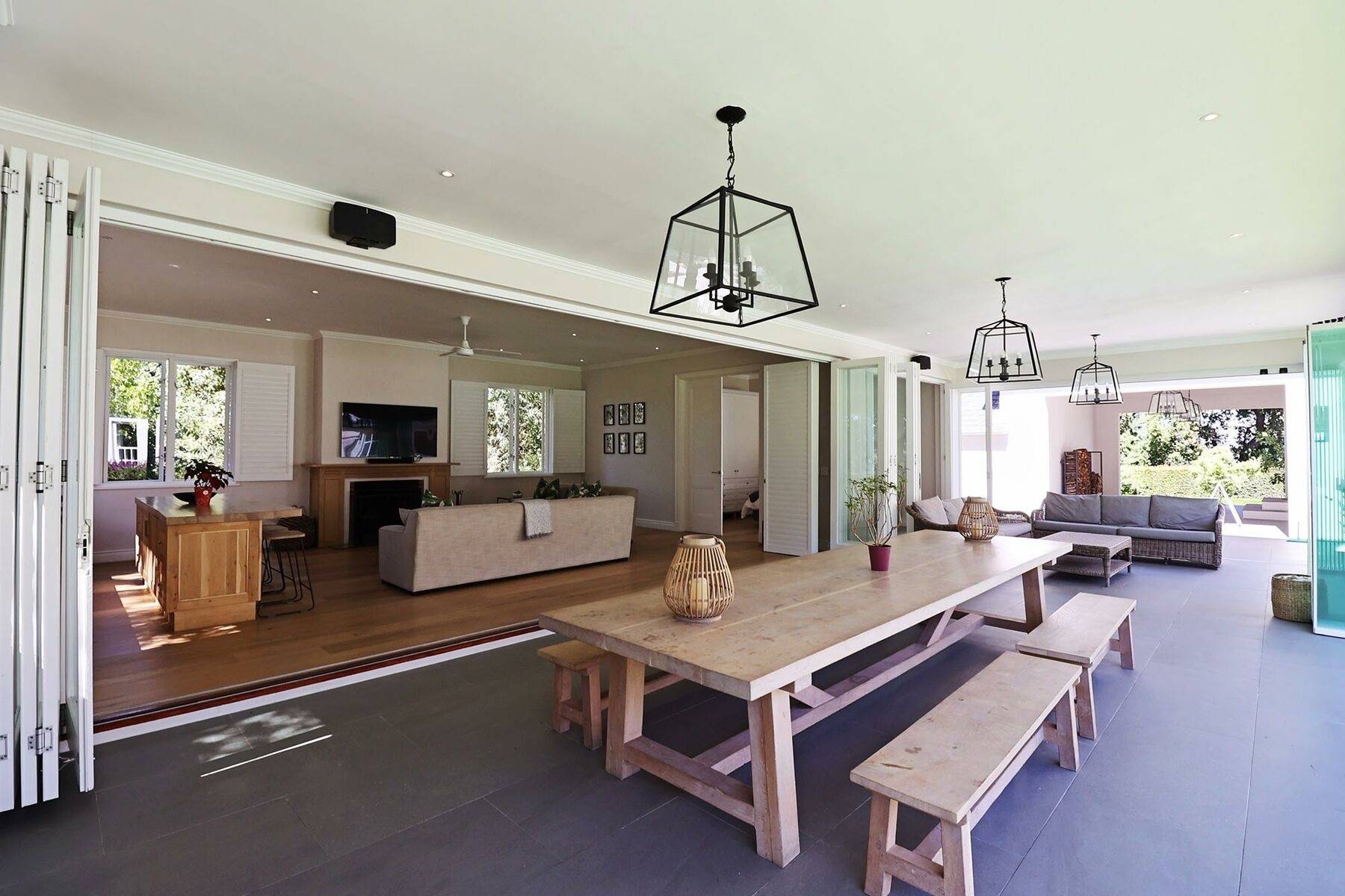 Das Poolhaus verfügt über einen eigenen Wohnbereich, der neben einem Wohnzimmer auch eine Küchentheke und einen Essbereich enthält. Große Fensterelemente lassen sich vollständig öffnen und ermöglichen einen direkten Zugang zum wunderschönen Garten und dem Pool.