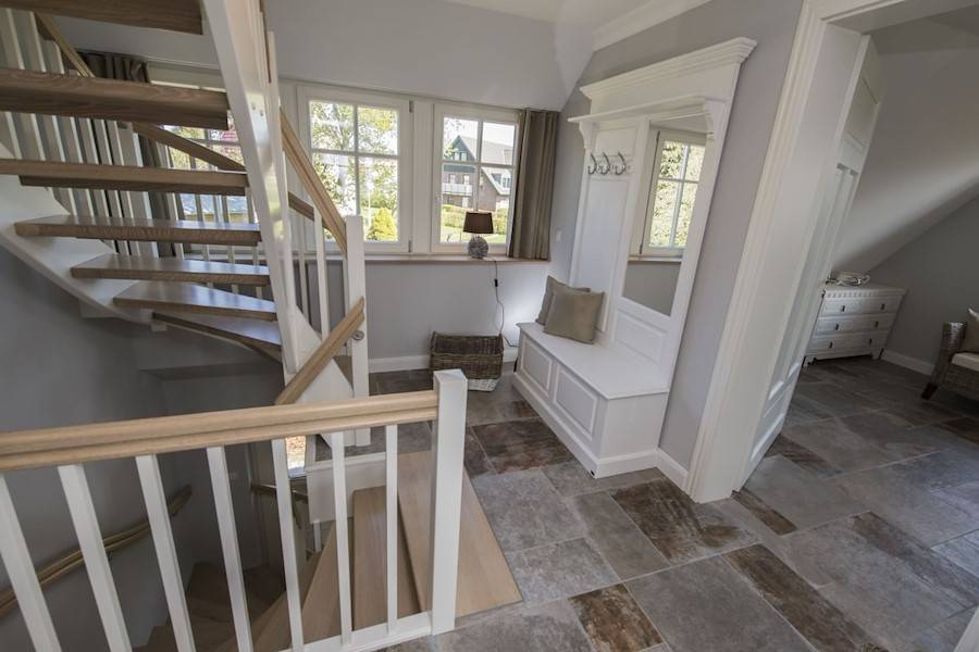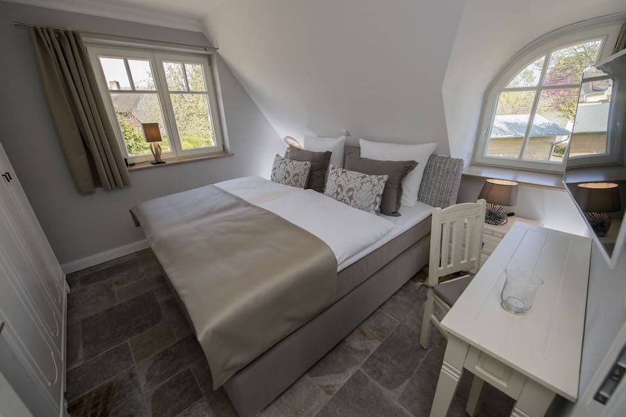 Über eine Treppe gelangen Sie in das Obergeschoß des Hauses. Hier befinden sich zwei geräumige Schlafzimmer mit je einem großen, bequemen Doppelbett (1.80 m x 2.00 m) und einem eigenen Flachbild-TV. Je ein Kleiderschrank bietet ausreichend Platz für Ihre Urlaubsgarderobe. In einem der Schlafzimmer gibt es zusätzlich einen separaten Ankleidebereich in dem eine Recamiere zum Platznehmen einlädt.