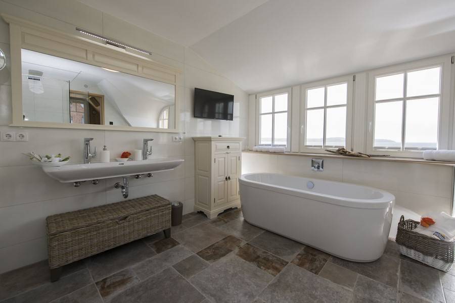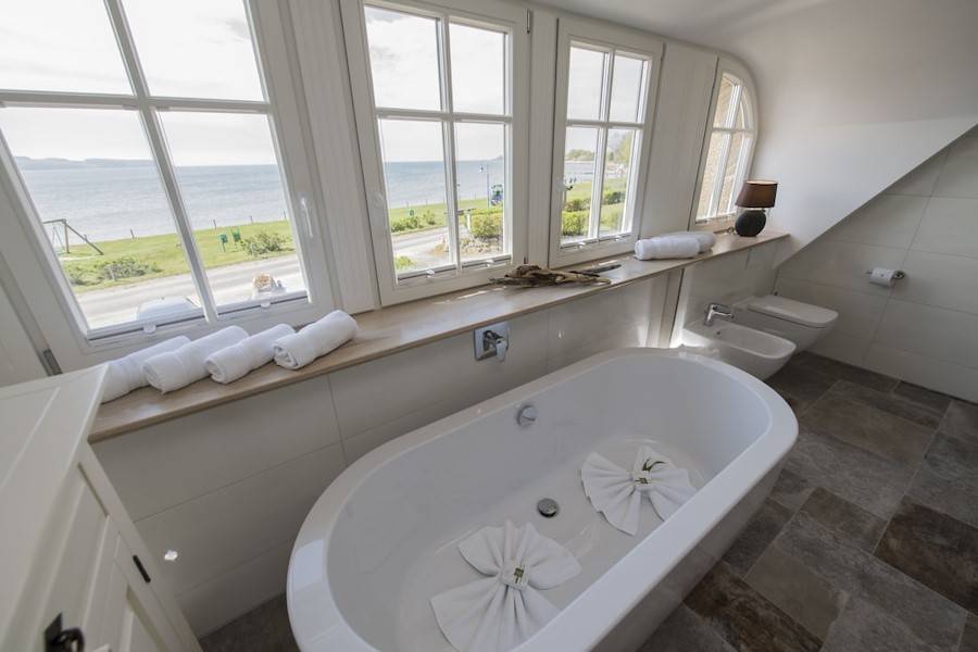 Das Highlight auf dieser Etage ist das zweite Bad dieses Hauses. Von der Badewanne aus bietet sich ein atemberaubender Blick auf die Hagensche Wieck. Hier ist Entspannung garantiert – unabhängig vom Wechsel der Jahreszeiten.