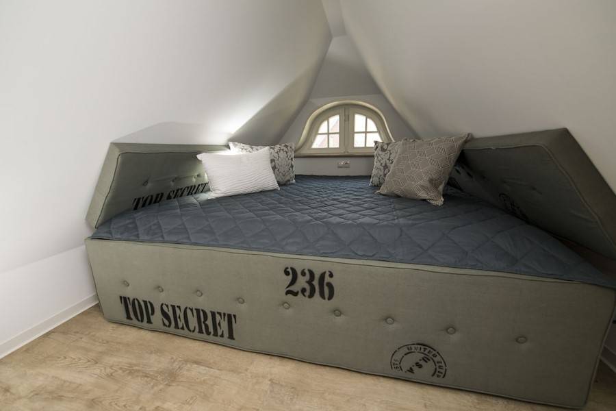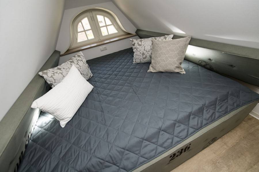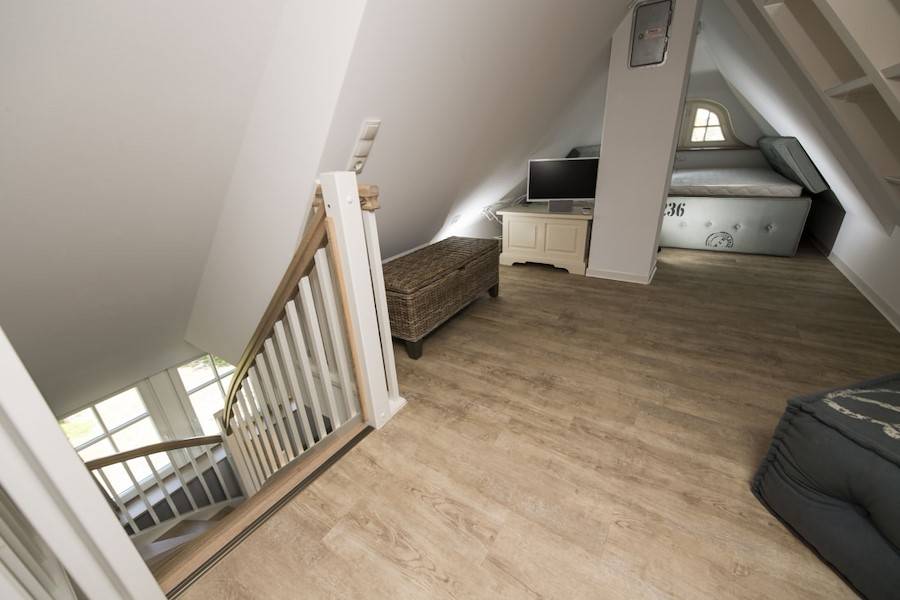 Die dritte Schlafgelegenheit mit zwei einzeln stehenden Kajütenbetten befindet sich im ausgebauten Spitzboden des Hauses und ist ideal für Kinder geiegnet.