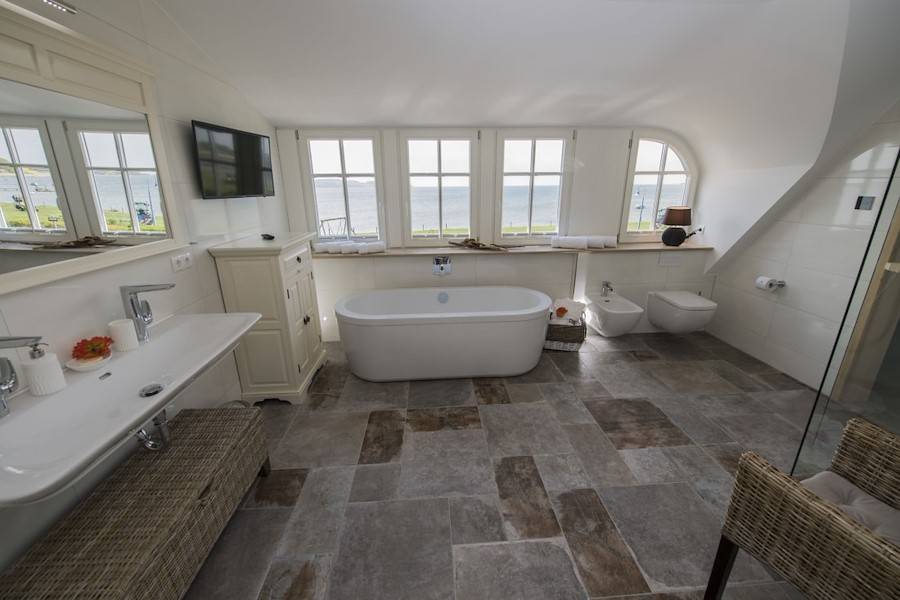 Eine große Walk-In-Dusche, ein Waschtisch, ein WC, ein Bidet sowie ein weiterer Flachbild-TV machen aus diesem Raum eine wahre Wellness-Oase. Eine Sauna, ebenfalls mit herrlichem Ausblick rundet den exklusiven Eindruck ab.
