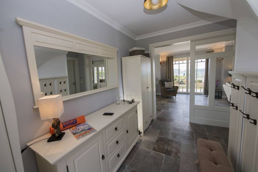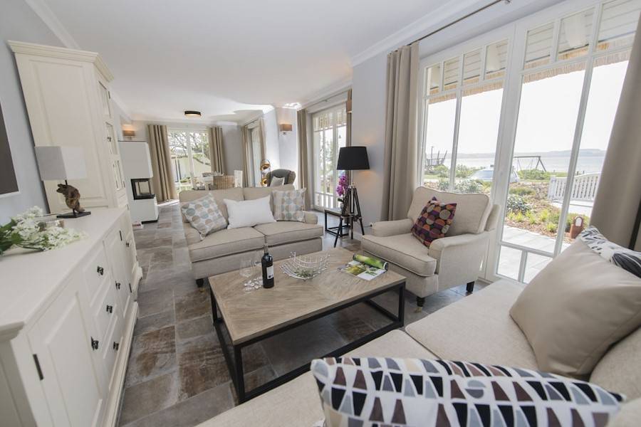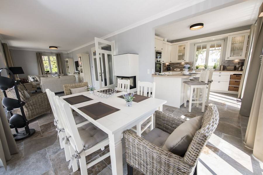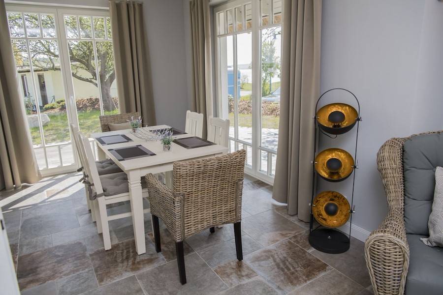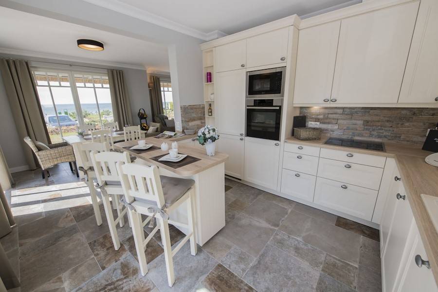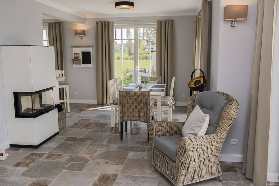 Der großzügige Wohnbereich mit Esstisch für 6 Personen und einer angrenzenden, hochwertigen Küche befindet sich im Erdgeschoß. Das Wohnzimmer ist mit einer gemütlichen Sitzecke und einem Flachbild-TV ausgestattet. In der kühleren Jahreszeit verbreitet ein prasselndes Kaminfeuer die besondere Gemütlichkeit. Zwei gemütliche Sitzgelegenheiten, platziert vor einer der großen Glasfronten laden zum Verweilen und Entspannen ein und bieten einen ungehinderten Blick auf die Weite der Hagenschen Wieck und die Zickerschen Berge.