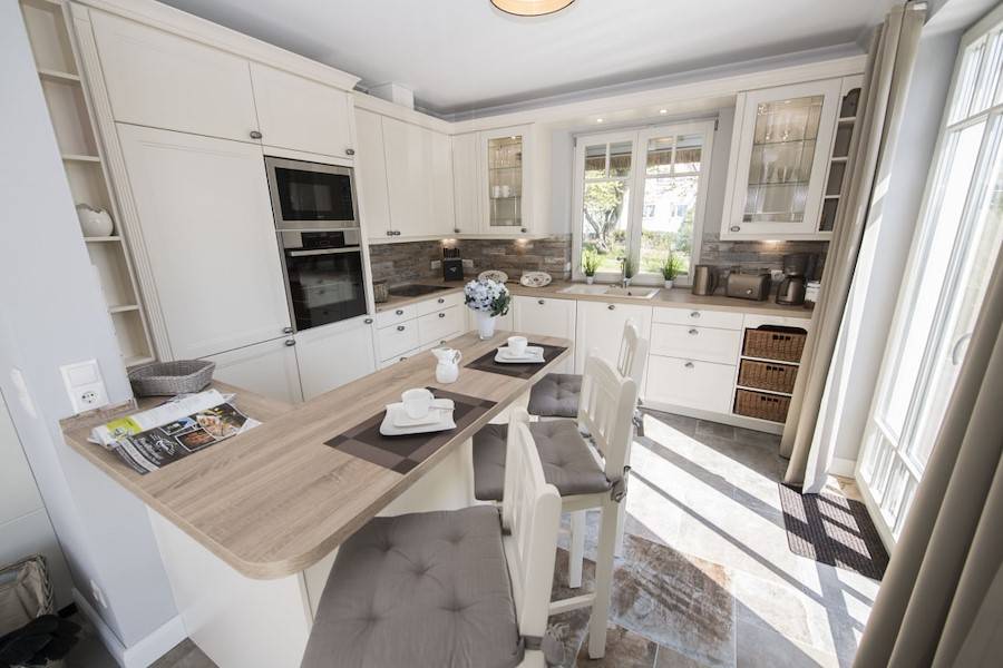 Im angrenzenden Küchenbereich befindet sich eine komplett ausgestattete Küchenzeile mit einem 4-Zonen-Induktionskochfeld, Backofen, Mikrowelle, Geschirrspüler, Kühlschrank mit Gefrierfach, Kaffeemaschine, Toaster, Wasserkocher und diversem Kleininventar. Ein Küchentresen mit Hockern komplettiert die hochwertige Einrichtung.