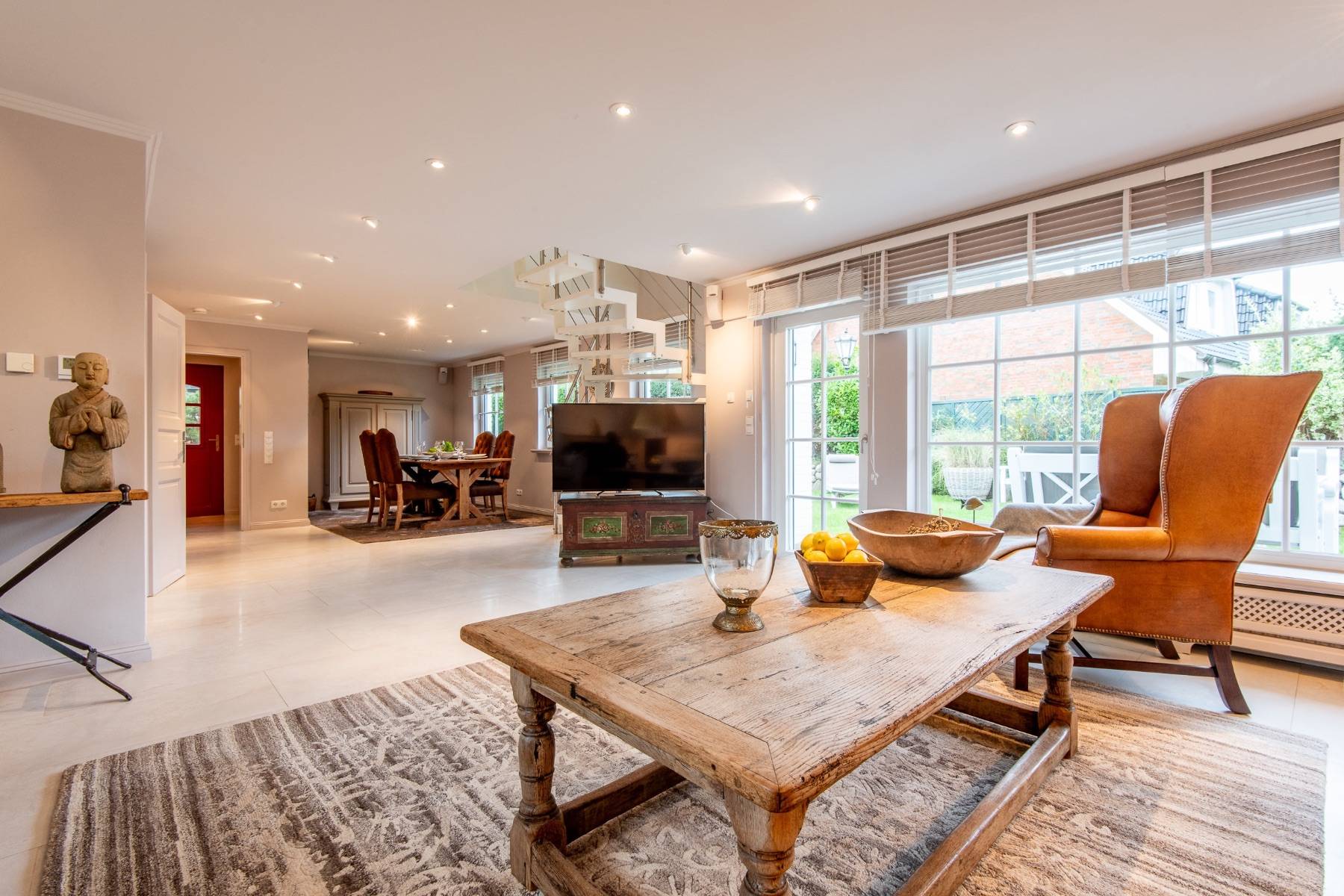Edle Bodenfliesen, warme Pastellfarben und ein stilvolles Interieur zeichnen das Ferienhaus Rosenhus in Alt – Westerland aus. Viel Freiraum findet man im überdurchschnittlich großen Wohn- und Essbereich. Entspannte Abende lassen sich auf einem der beiden gemütlichen Polstersofas vor dem offenen Kamin bei einem Glas Wein und erstklassiger Musik aus der Bose- Surround- Anlage genießen.