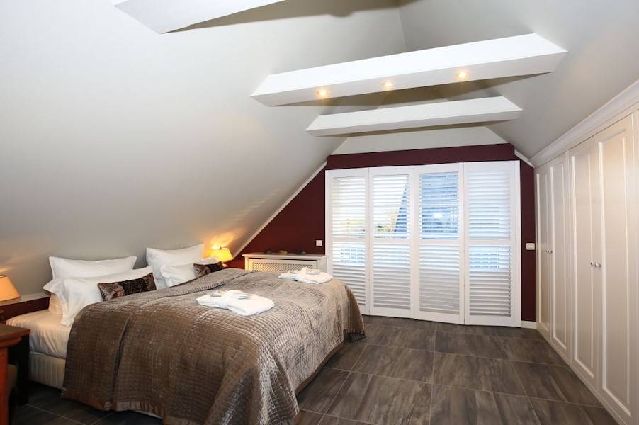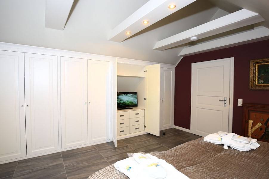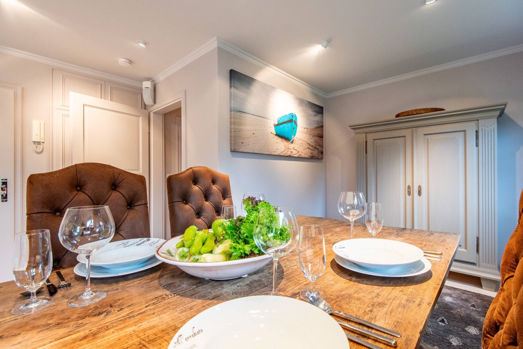 Zum Speisen oder klönen lädt auf der gegenüberliegenden Seite ein Massivholztisch nebst Stühlen ein. Eine erholsame Nachtruhe ist in einem der beiden Doppelbetten von Treca de Paris garantiert, die unter dem offenen Dachstuhl himmlische Träume ermöglichen. Beide Schlafzimmer bieten dank der maßgeschneiderten Schrankeinbauten viel Platz für die Garderobe und sind zudem mit je einem Flachbildschirm versehen. Auch Kinderherzen werden höher schlagen, sofern sie die integrierte Playstation 4 entdecken.