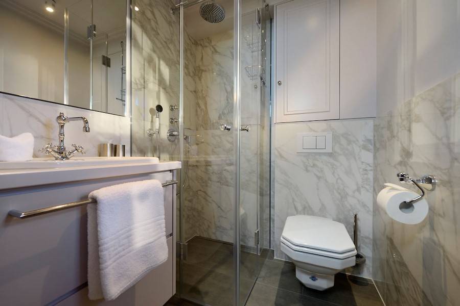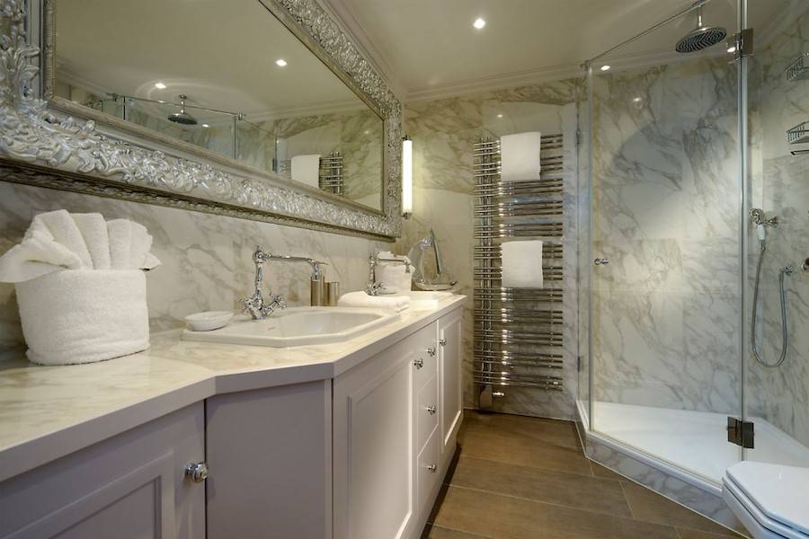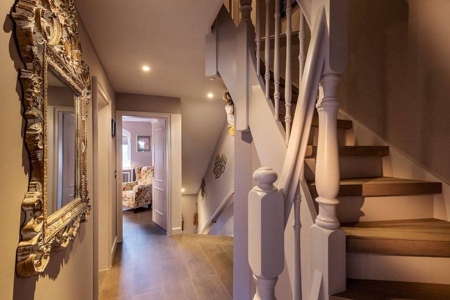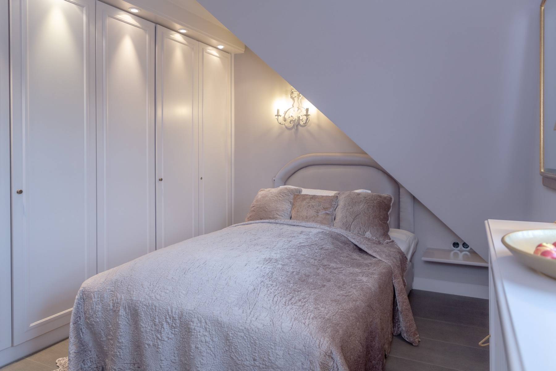 Das Obergeschoss beherbergt zwei Schlafzimmer – eines davon mit einem großen Doppelbett (ca. 180 x 200 cm) und das zweite mit einem überdurchschnittlichen Einzelbett (ca. 120 x 200 cm), die beide über einen eigenen Flachbildschirm verfügen. Das exklusive Badezimmer ist in weißem Marmor umrahmt und verfügt über ein Doppelwaschbecken und eine Dusche. Eine Miele Waschmaschine und ein Wäschetrockner wurden sorgfältig hinter einer einem Einbauschrank versteckt.