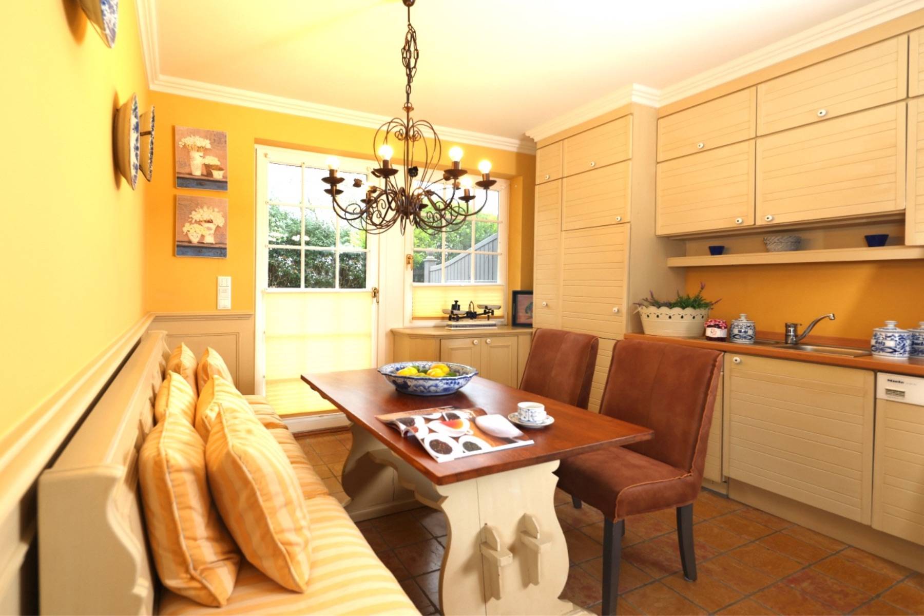 Die Ferienwohnung Biberhüs in Archsum erstreckt sich auf einer Ebene im Erdgeschoss. Das Wohnzimmer ist mit Fliesen und Teppich, als auch maßgeschneiderten Einbauten versehen. Ein gemütliches Polstersofa mit Zierkissen und Sessel samt Hocker laden zum Entspannen ein. Durch einen breiten Durchgang gelangt man in die Küche, die mit allen erforderlichen Elektrogeräten (bspw. eine Miele- Waschmaschine und Geschirrspülmaschine) ausgestattet ist. Der große Esstisch und eine gepolsterte Sitzbank samt Stühlen laden mit Vorfreude zu einem ausgiebigen Frühstück ein. Von hier aus gelangen Sie zudem direkt auf die Terrasse und in den idyllischen Garten.