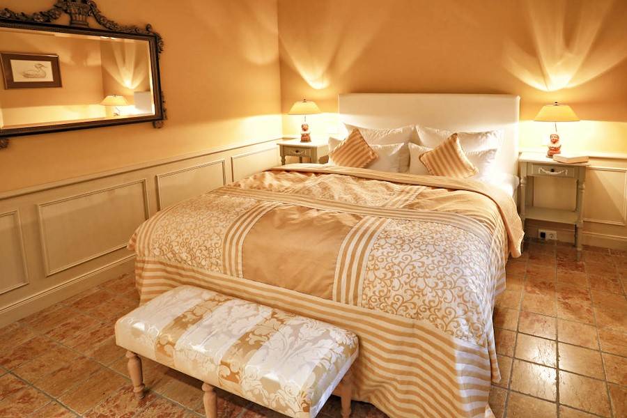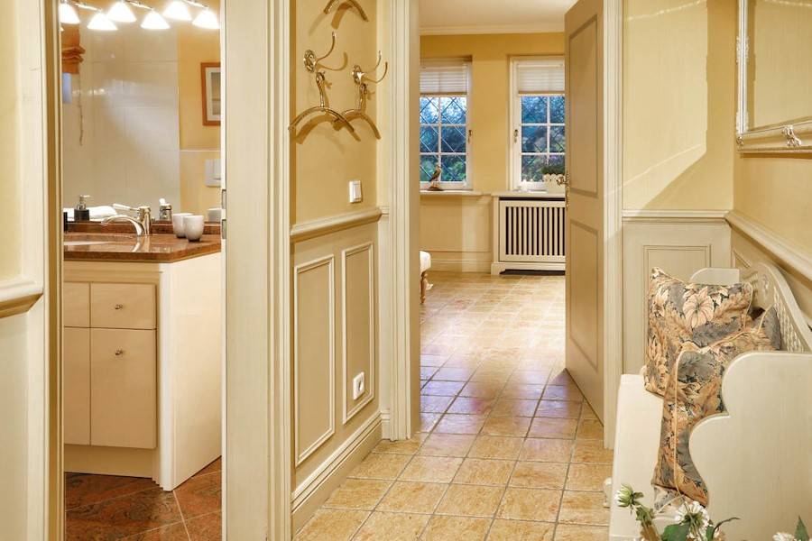 Alle Räume sind mit edlen Stoffen und Vorhängen versehen, zahlreiche Bilder und Spiegel schmücken die Wände. Zudem zieren zahlreiche Lampen und verschiedene Accecoires dieses einzigartige Ambiente. Königlich wirkt die cremefarbene Holzvertäfelung, die etwa einen Meter hoch vom Boden die gesamte Wohnung ziert.