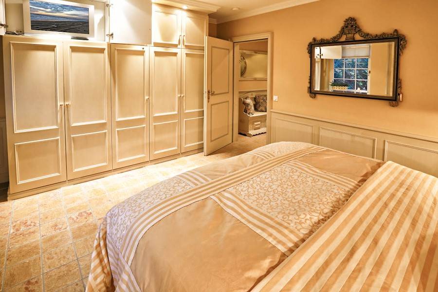 Das Schlafzimmer ist mit einem deckenhohen Kleiderschrank versehen, der überdurchschnittlichen Platz für die Garderobe ermöglicht, in dem auch ein Fernseher verstaut ist. Das komfortable Doppelbett und die zahlreichen Kissen sorgen für einen erholsamen Schlaf.