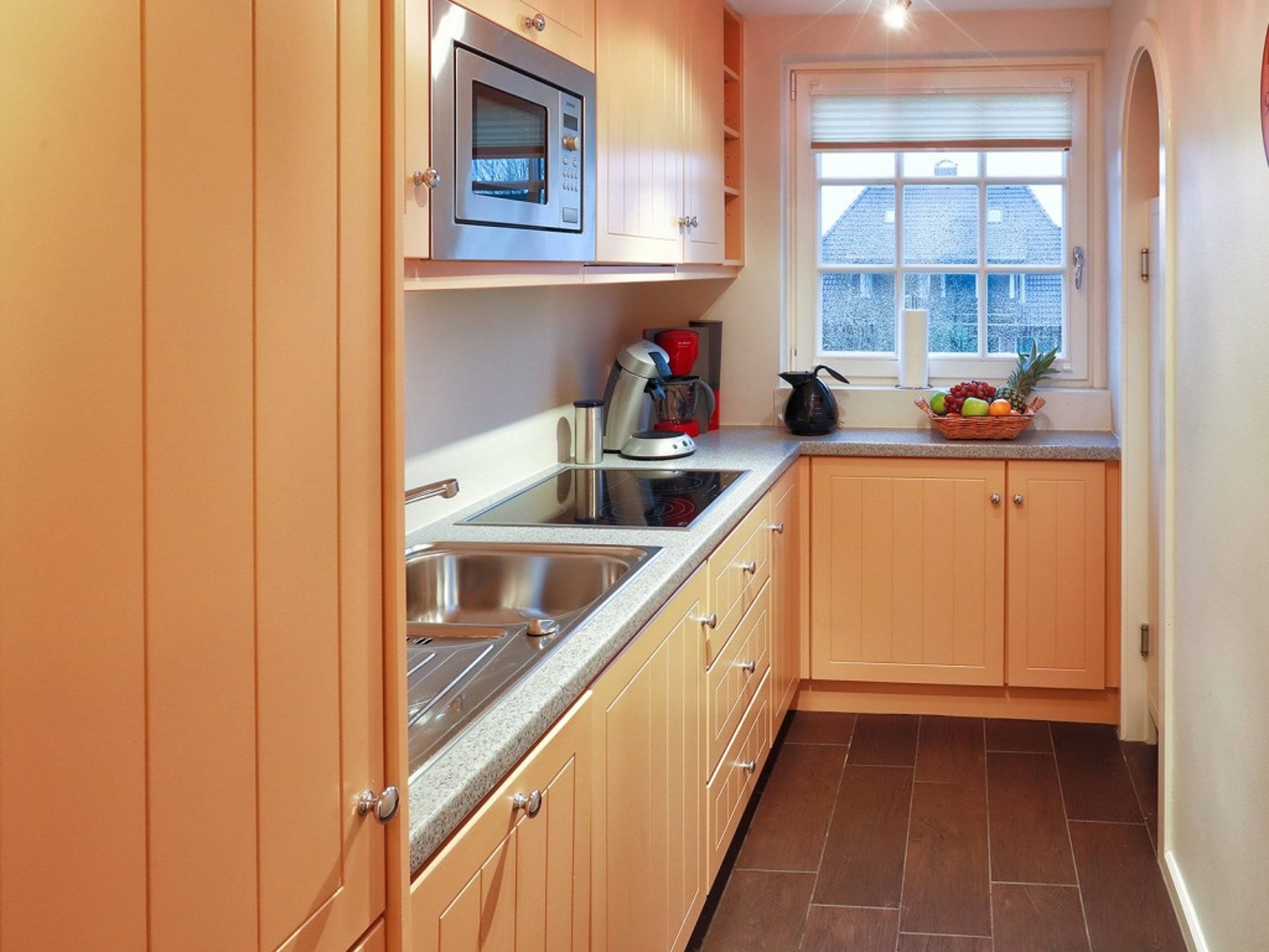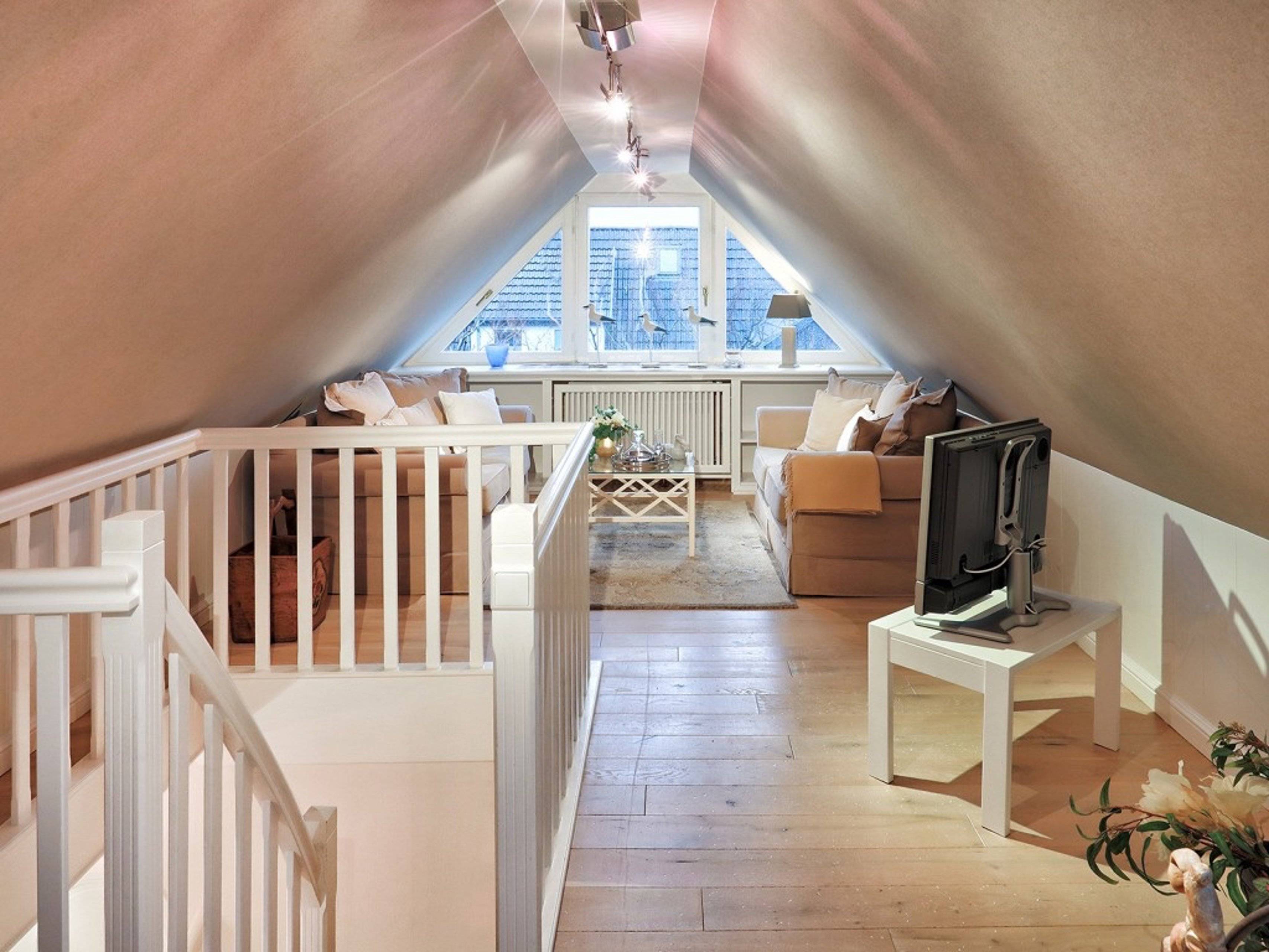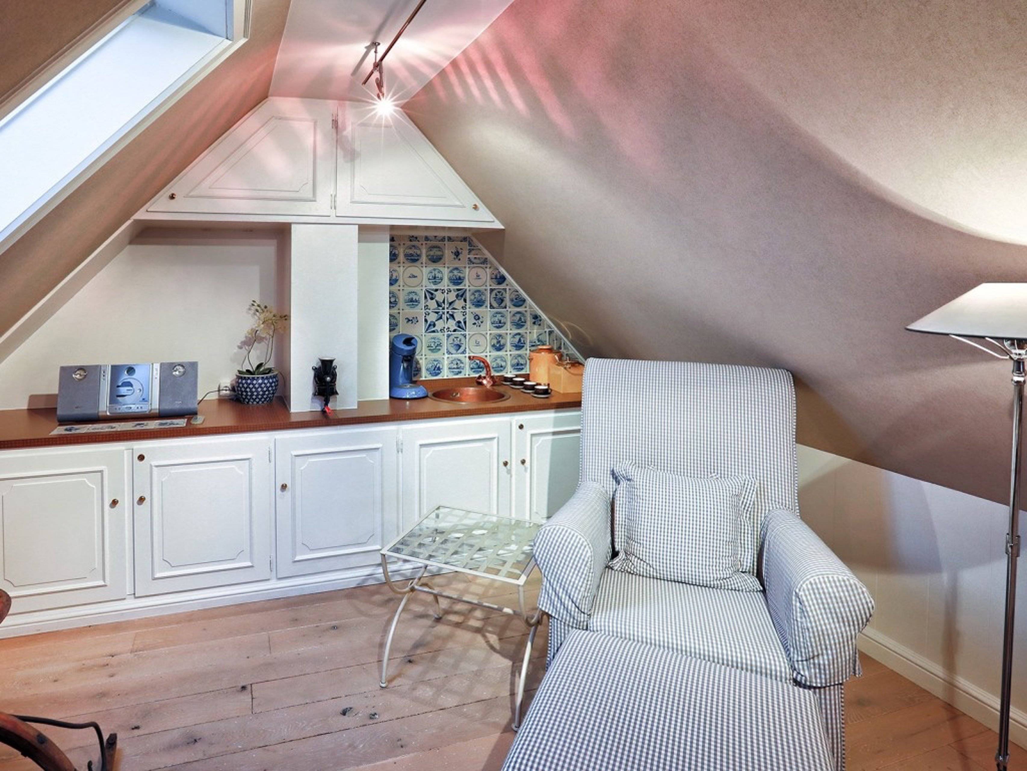 Ebenso originell und außergewöhnlich ist die Teeküche im Dachgeschoss, die zum verweilen und entspannen verführt. Eine größere Einbauküche ist in der unteren Etage, also im Obergeschoss vorhanden und neben einem Cerankochfeld auch mit einer Mikrowelle, einer Geschirrspülmaschine und einem Kühlschrank ausgestatte.