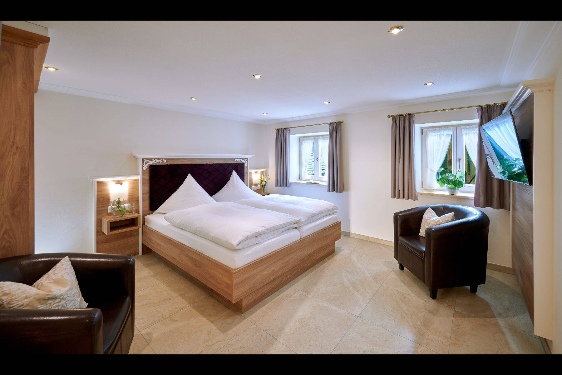 Bergblick Bettwäsche Doppelbett Fenster Flatscreen Fußbodenheizung Kleiderschrank Rauchmelder Safe Stuhl Vorhänge