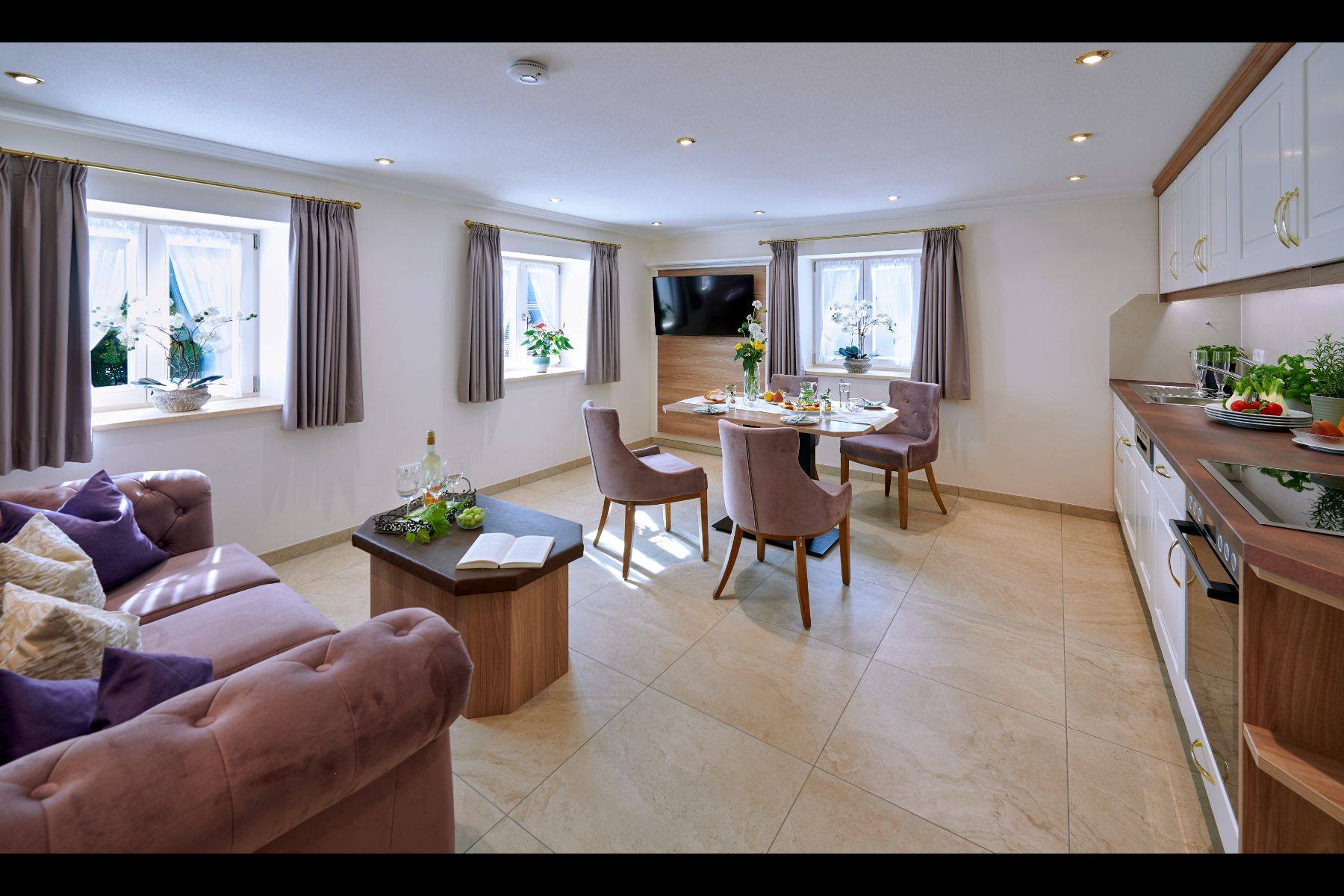 Backofen Bergblick Cerankochfeld Esstisch Fenster Flatscreen Fußbodenheizung Geschirr & Besteck Geschirrhandtücher Geschirrspülmaschine Kaffeemaschine Küchenutensilien Kühl- / Gefrierschrank Mixer Pfannen Sofa Stühle Toaster Töpfe Vorhänge