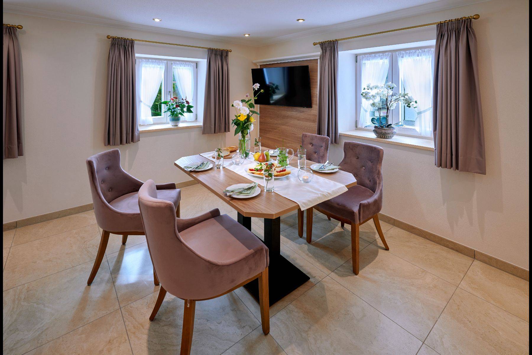Mit dem Blick Richtung Park ist die Ferienwohnung zur Süd-Westseite ausgerichtet und im Erdgeschoss des Bonnschlössl bequem zu erreichen. Ein gemütlicher Wohn-Essbereich mit Esstisch und Sitzecke bildet einen harmonischen Ort, an dem sich unsere Gäste sofort wie zuhause fühlen.