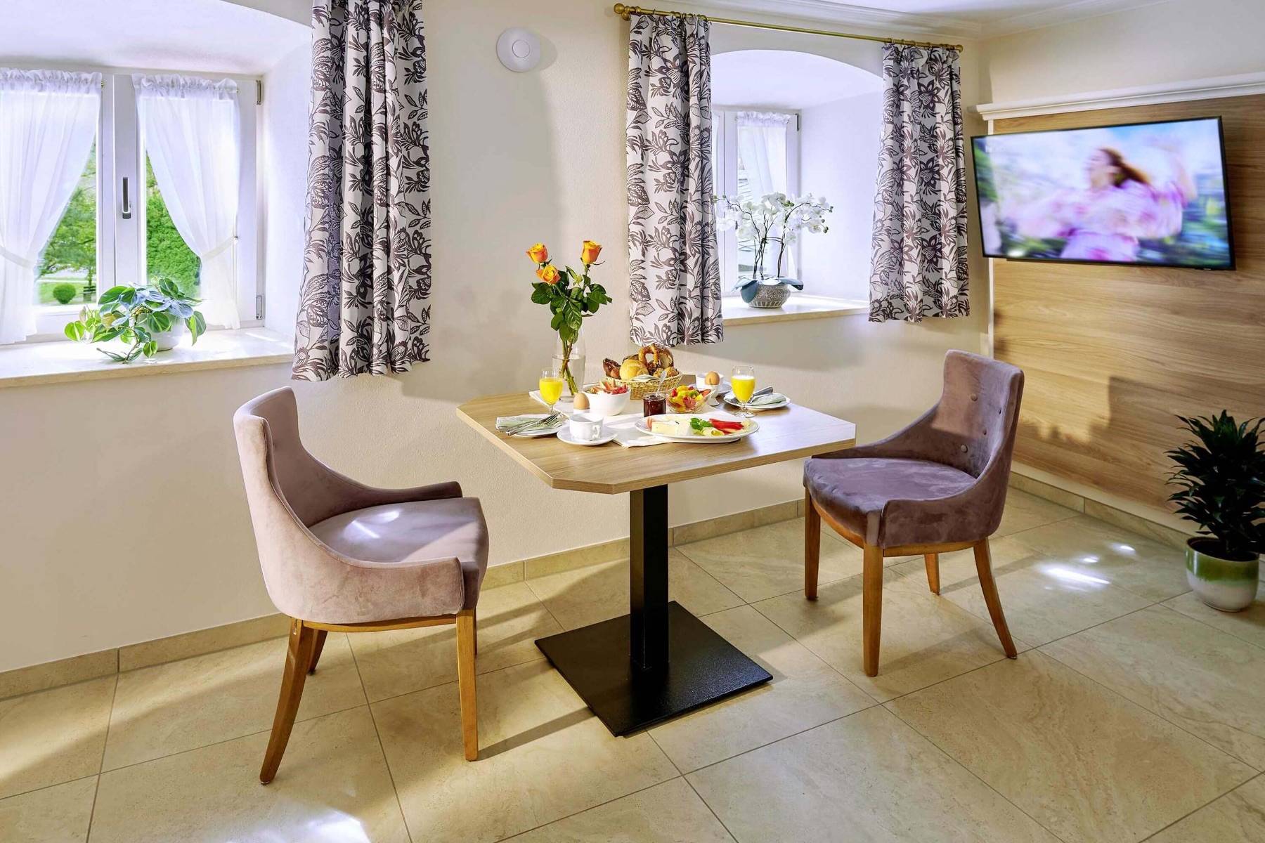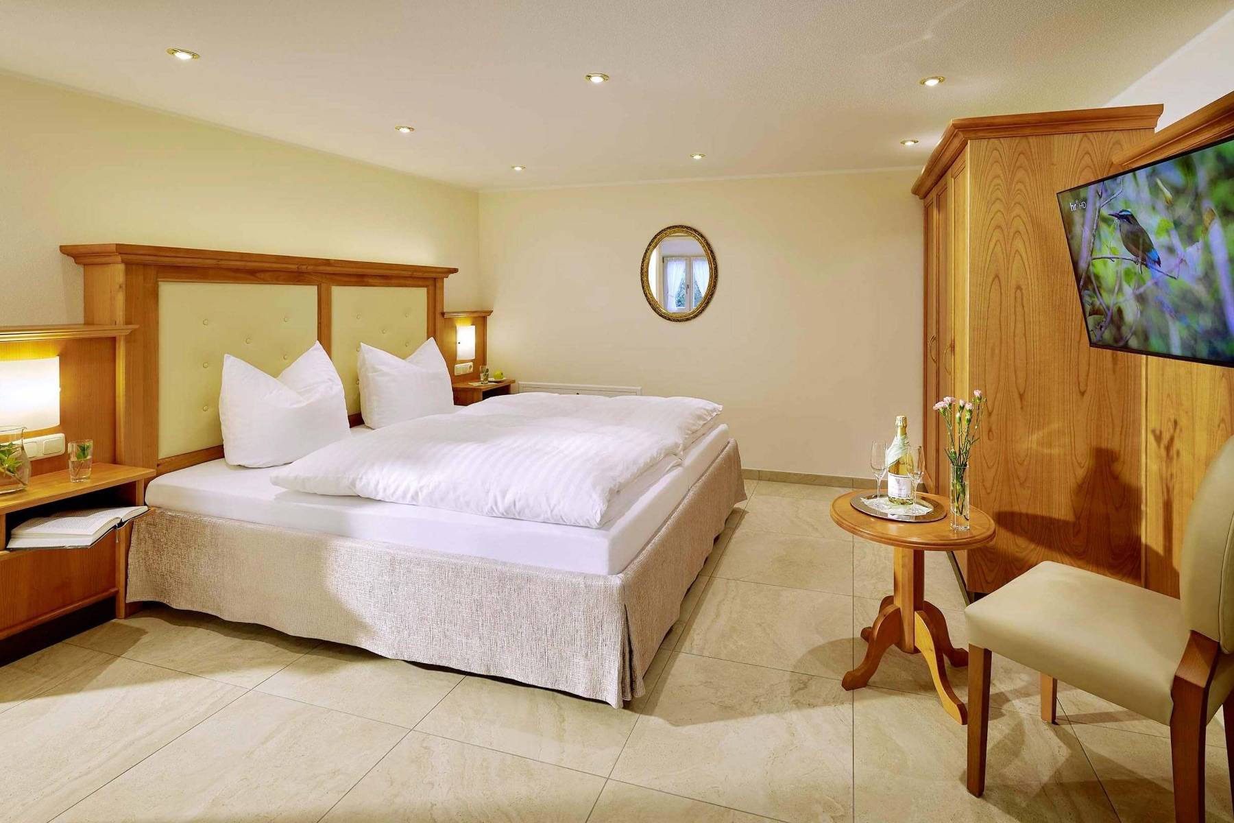 Bettwäsche Doppelbett Fenster Flatscreen Fußbodenheizung Kleiderschrank Rauchmelder Safe Stuhl Vorhänge