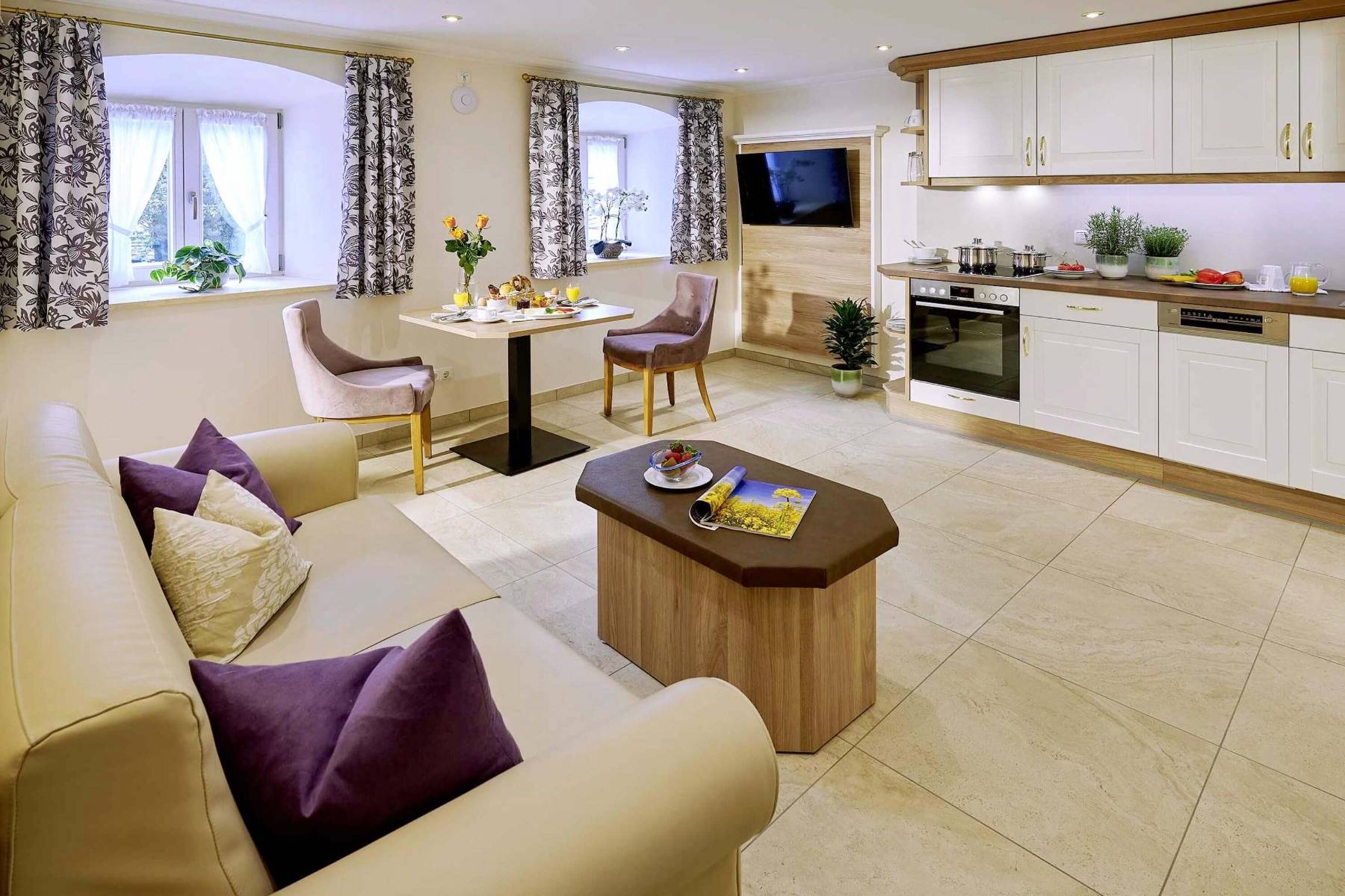 Backofen Cerankochfeld Dunstabzug Esstisch Fenster Flatscreen Fußbodenheizung Geschirr & Besteck Geschirrhandtücher Geschirrspülmaschine Kaffeemaschine Küchentheke Küchenutensilien Kühl- / Gefrierschrank Pfannen Radio Sofa Stühle Toaster Töpfe Vorhänge Wasserkocher