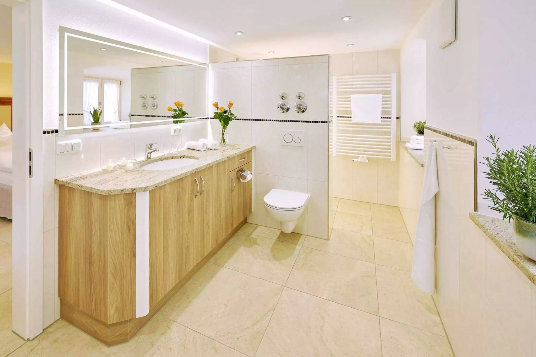Badetuch Fenster Fußbodenheizung Haartrockner Handtuch Handtuchheizkörper Seife Spiegel Walk- In- Dusche Waschbecken WC