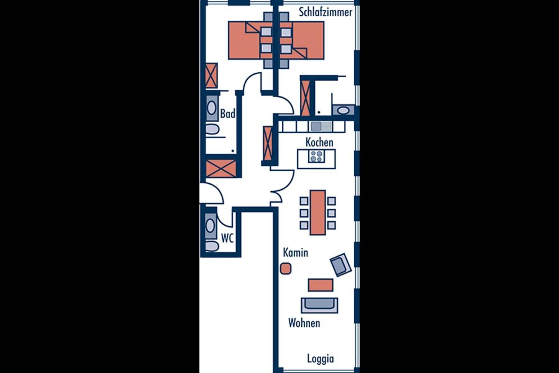 Betten: 4 • Schlafräume: 2 • Bäder: 2 • 104 m²