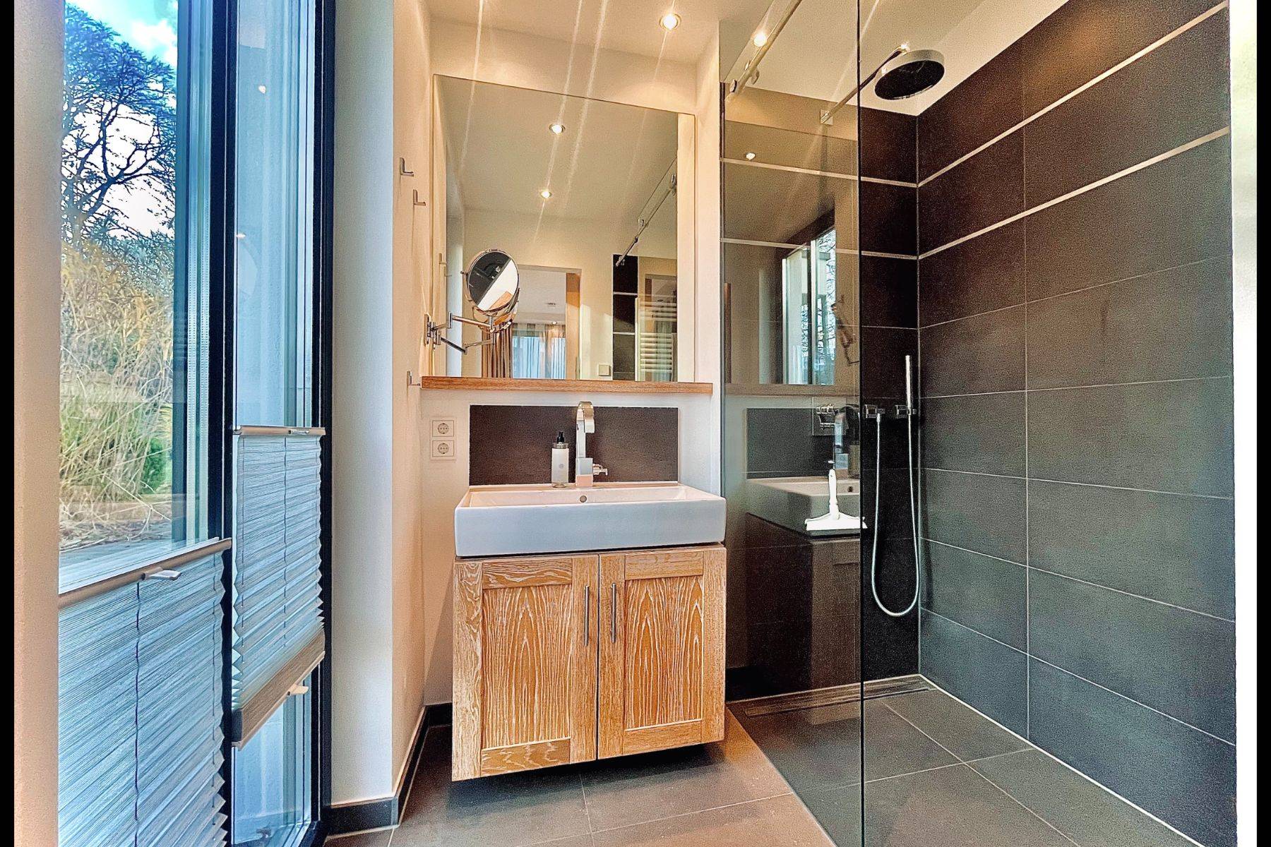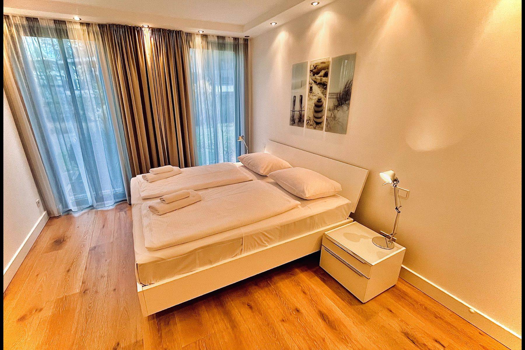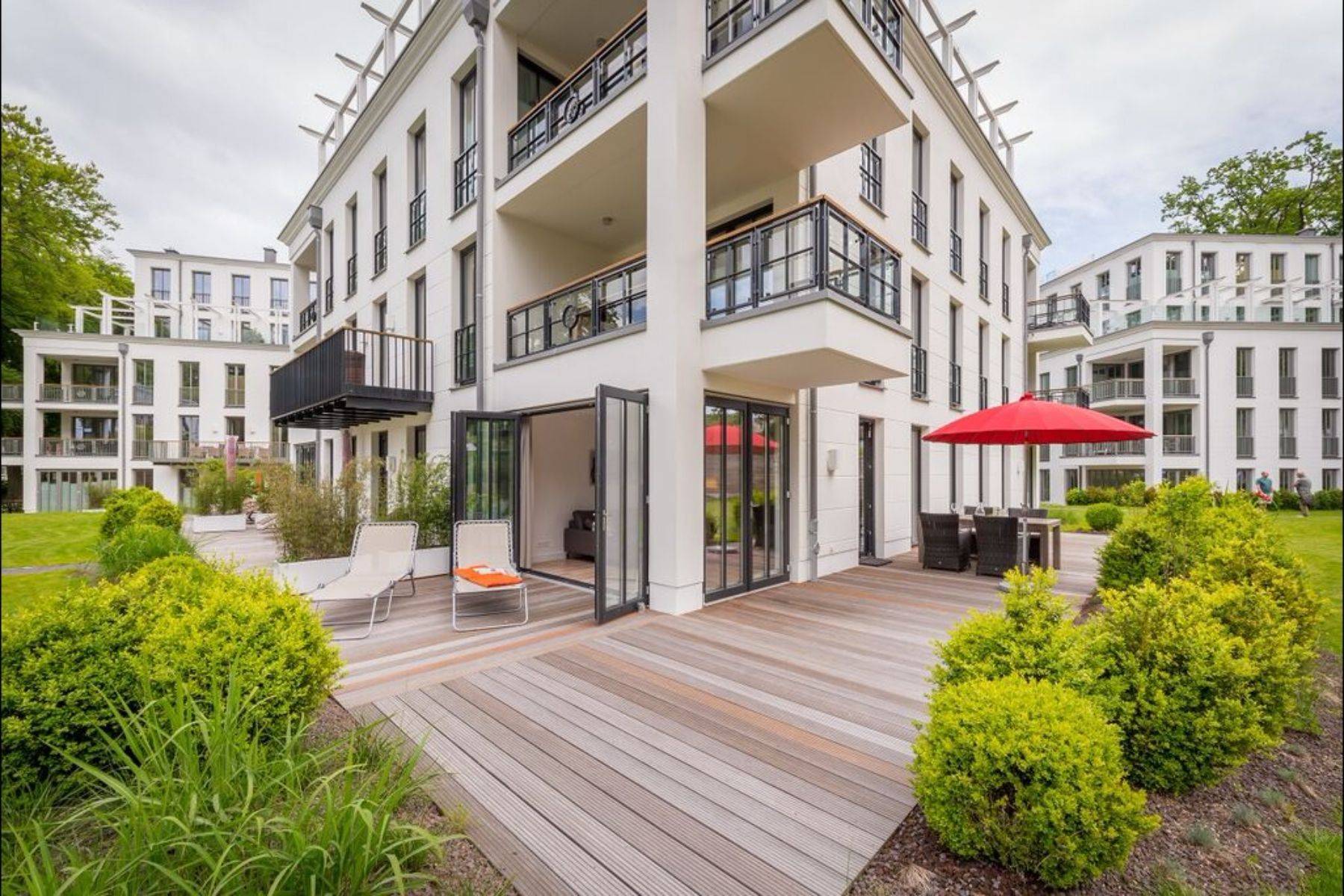 Der lichtdurchflutete Wohn- und Essbereich (50 m²) öffnet sich zu einer großzügigen Terrasse mit Loggia-Charakter. Hier genießen Sie den Blick auf den stilvoll angelegten Garten, den glitzernden Außenpool (5 x 15 x 1,20 m) und das ruhige Waldgebiet Granitz. Zwei Schlafzimmer mit ensuite Badezimmern versprechen erholsamen Schlaf, während die moderne Küche mit Kochinsel zu genussvollen Momenten einlädt.
