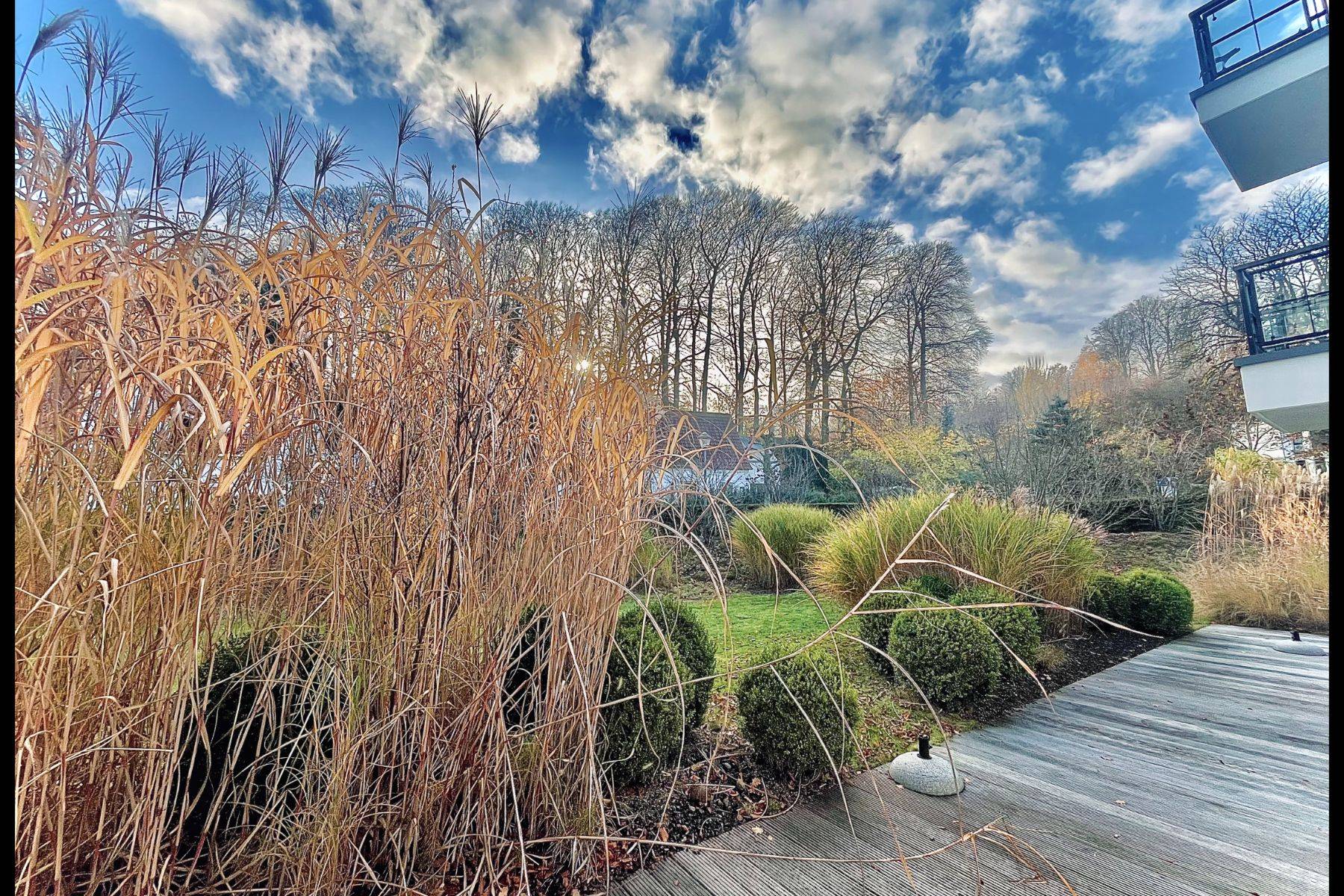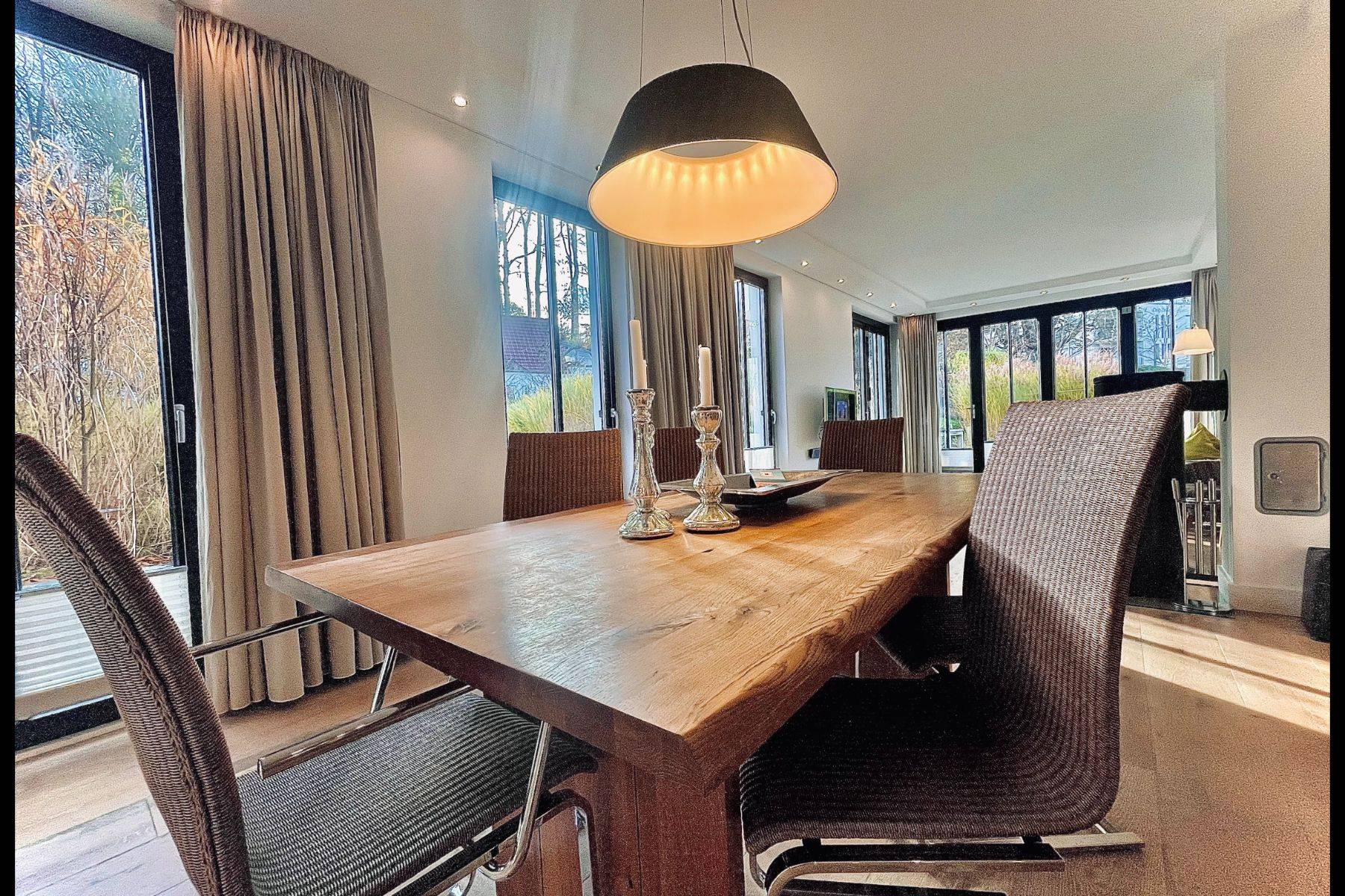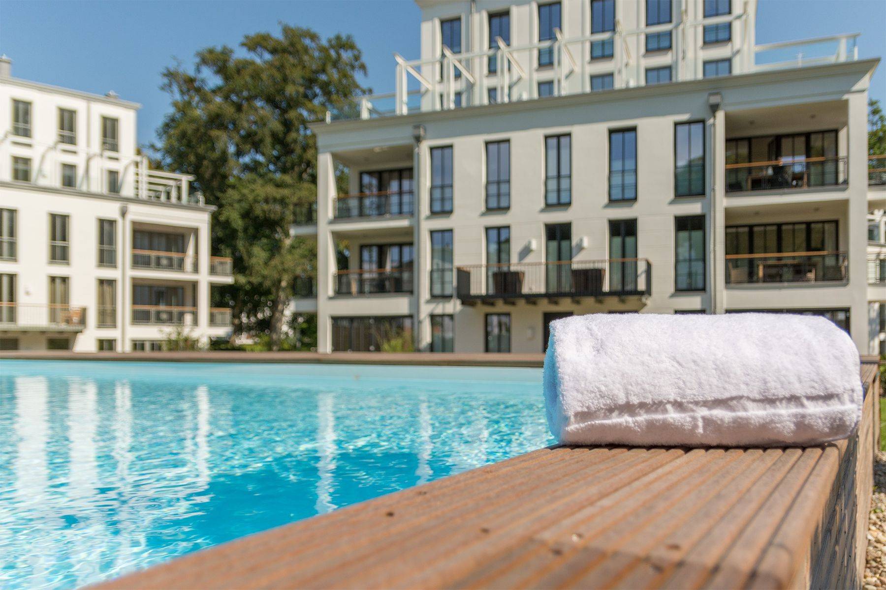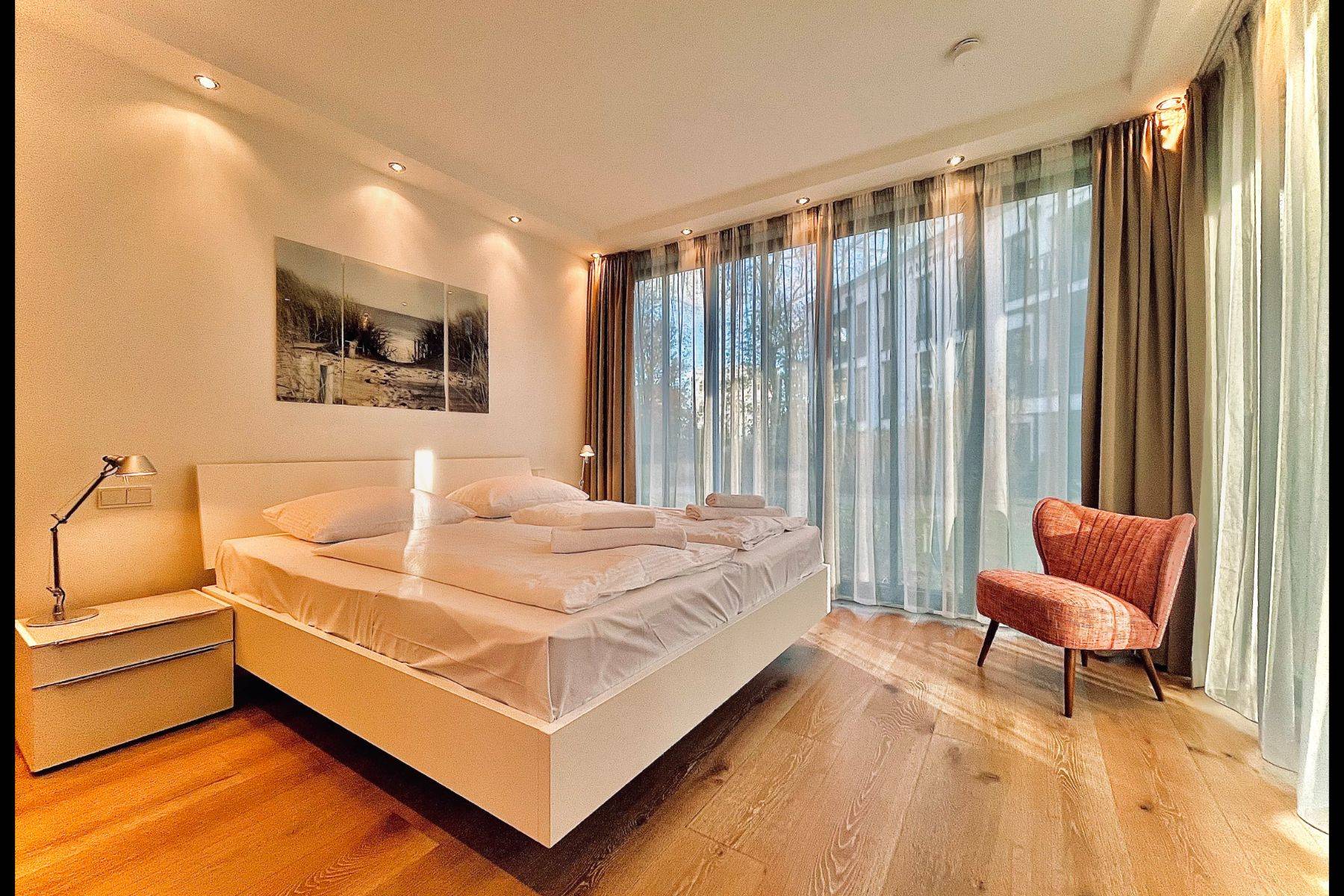 Der lichtdurchflutete Wohn- und Essbereich (50 m²) öffnet sich zu einer großzügigen Terrasse mit Loggia-Charakter. Hier genießen Sie den Blick auf den stilvoll angelegten Garten, den glitzernden Außenpool (5 x 15 x 1,20 m) und das ruhige Waldgebiet Granitz. Zwei Schlafzimmer mit ensuite Badezimmern versprechen erholsamen Schlaf, während die moderne Küche mit Kochinsel zu genussvollen Momenten einlädt.