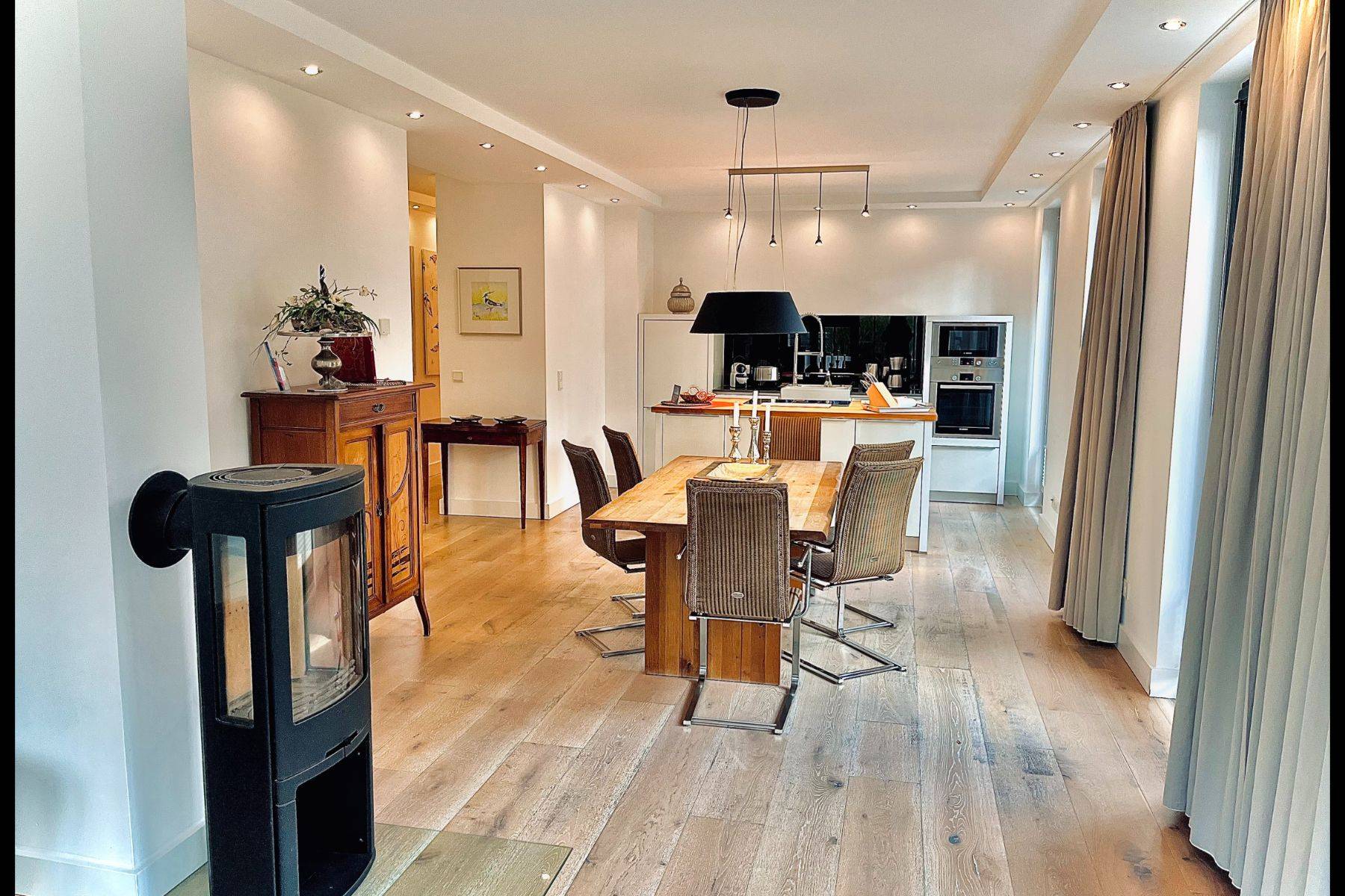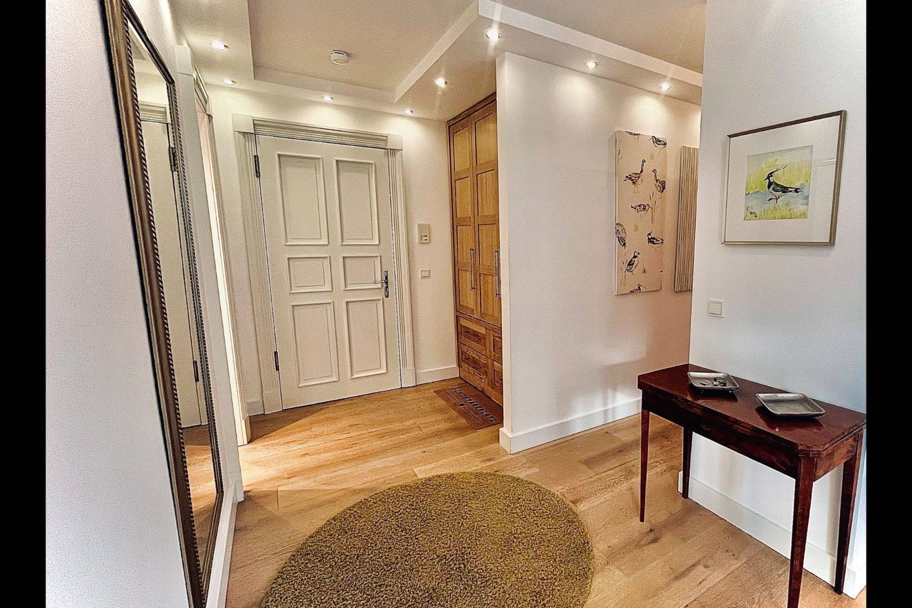 Auf ca. 104 m² erwartet Sie Wohnkomfort der Extraklasse. Vom Tiefgaragenplatz gelangen Sie bequem mit dem Aufzug direkt in Ihr Refugium. Edle gekälkte Eichenböden, eigens entworfene Holztüren und Zargen, warme Fußbodenheizung – alles ist auf Wohlbefinden und Eleganz ausgerichtet.