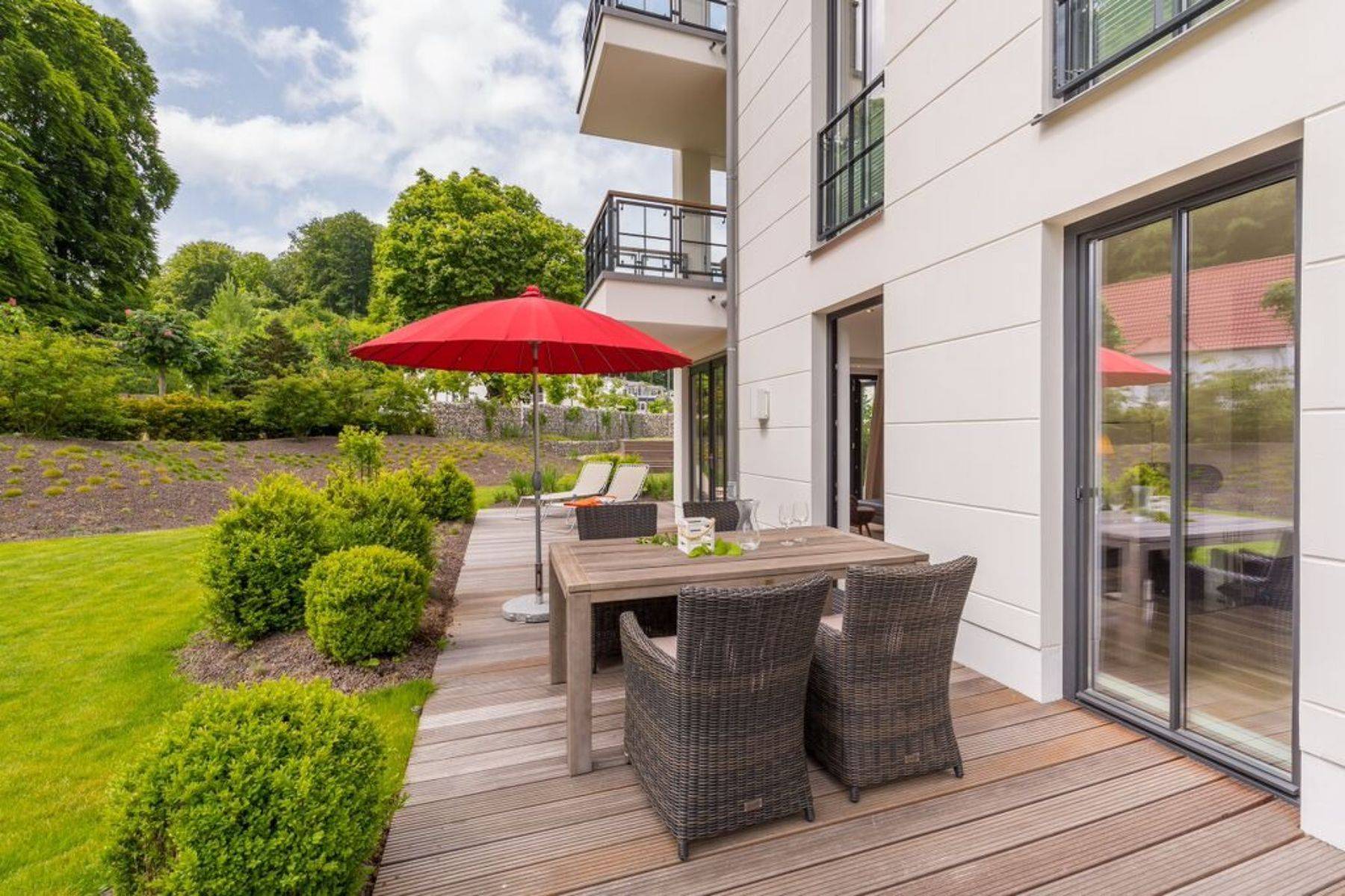 Terrasse & Ausblick auf Garten, Außenpool und das Waldgebiet Granitz