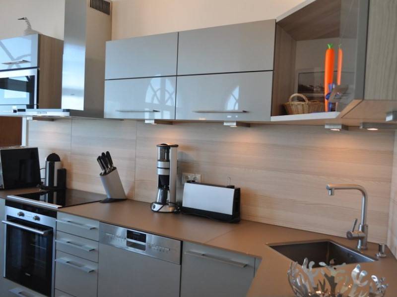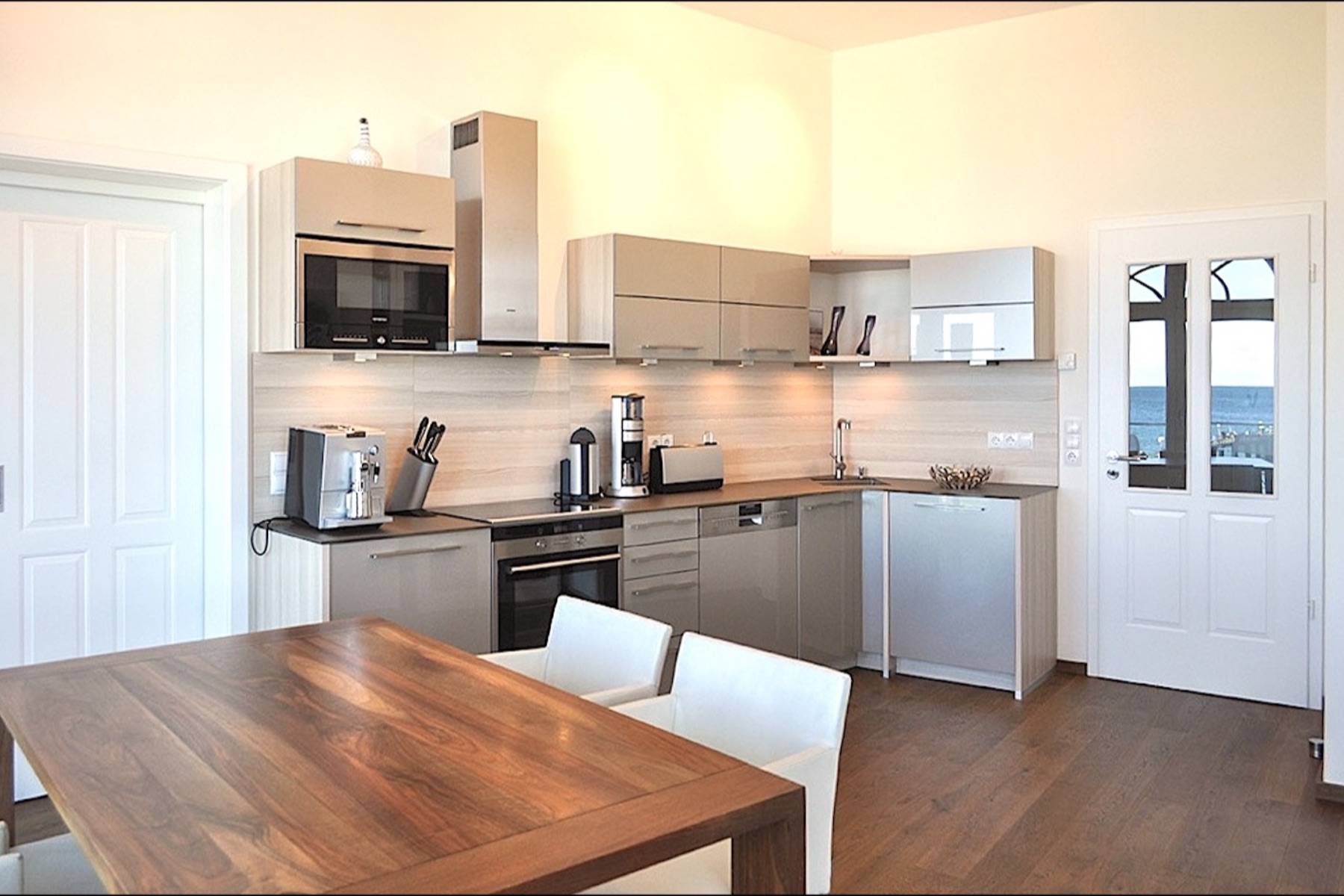 Die moderne Küche ist mit einem Induktions-Ceramik-Kochfeld, Siemensgeräten sowie einer Spülmaschine, Backofen, Mikrowelle, zwei Kühlschränken und einem Espresso-Vollautomat von Jura ausgestattet.