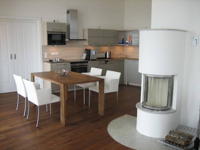 Alle Räume der Ferienwohunung sind mit edlem Parkett ausgestattet. Der offene Kamin ist von 3 Seiten einsehbar, genießen Sie das Wechselspiel von Feuer und Wasser.