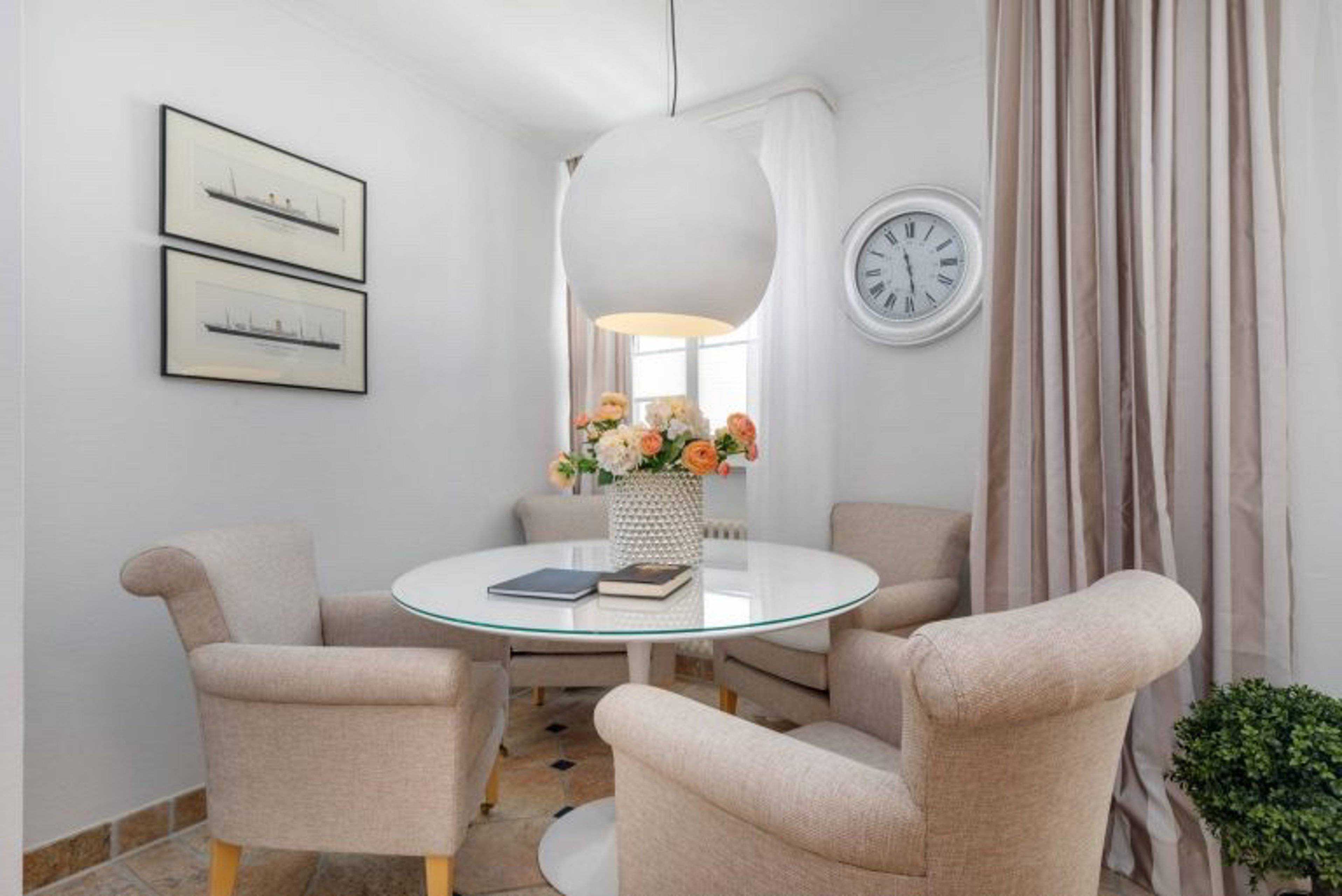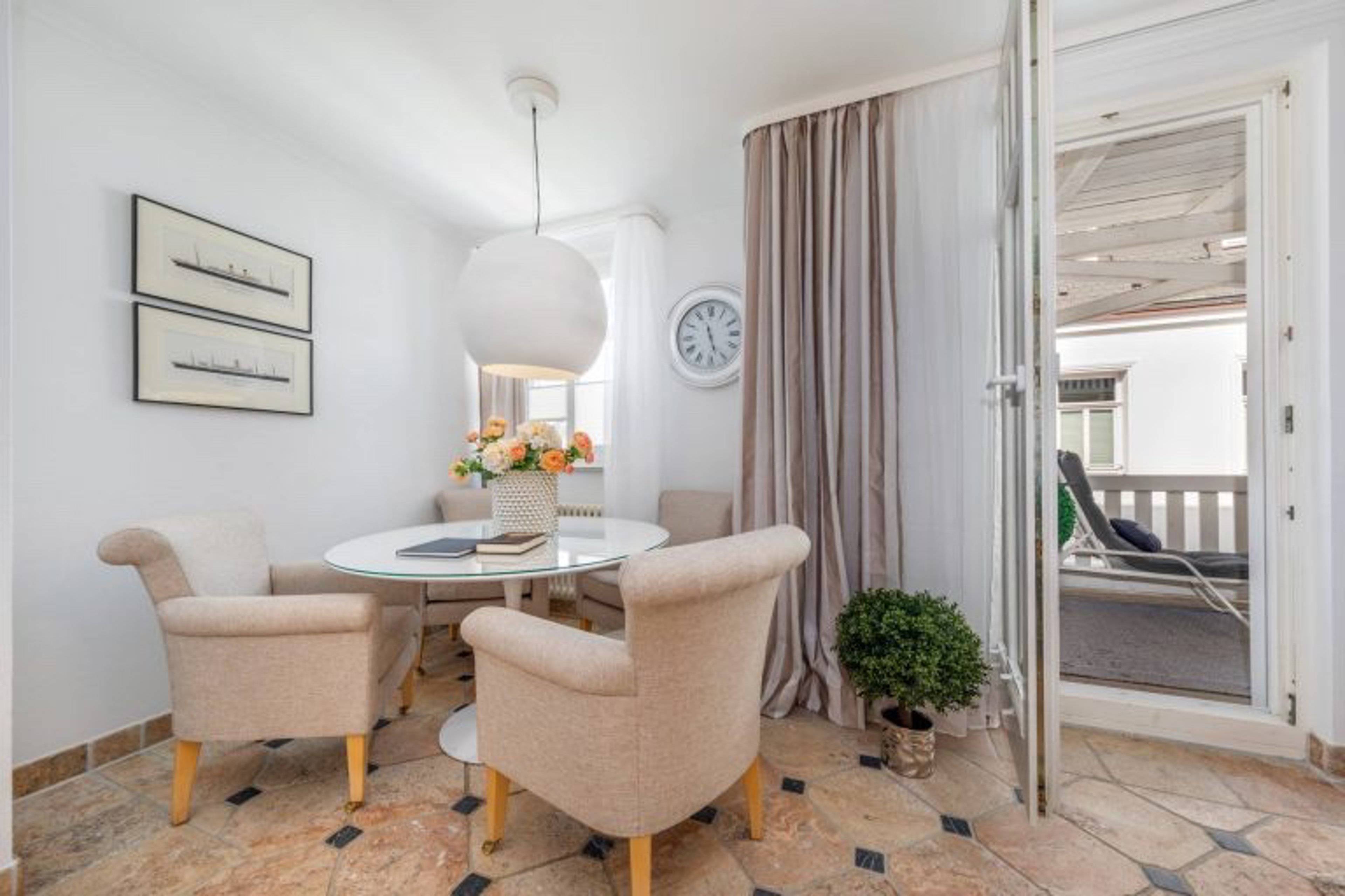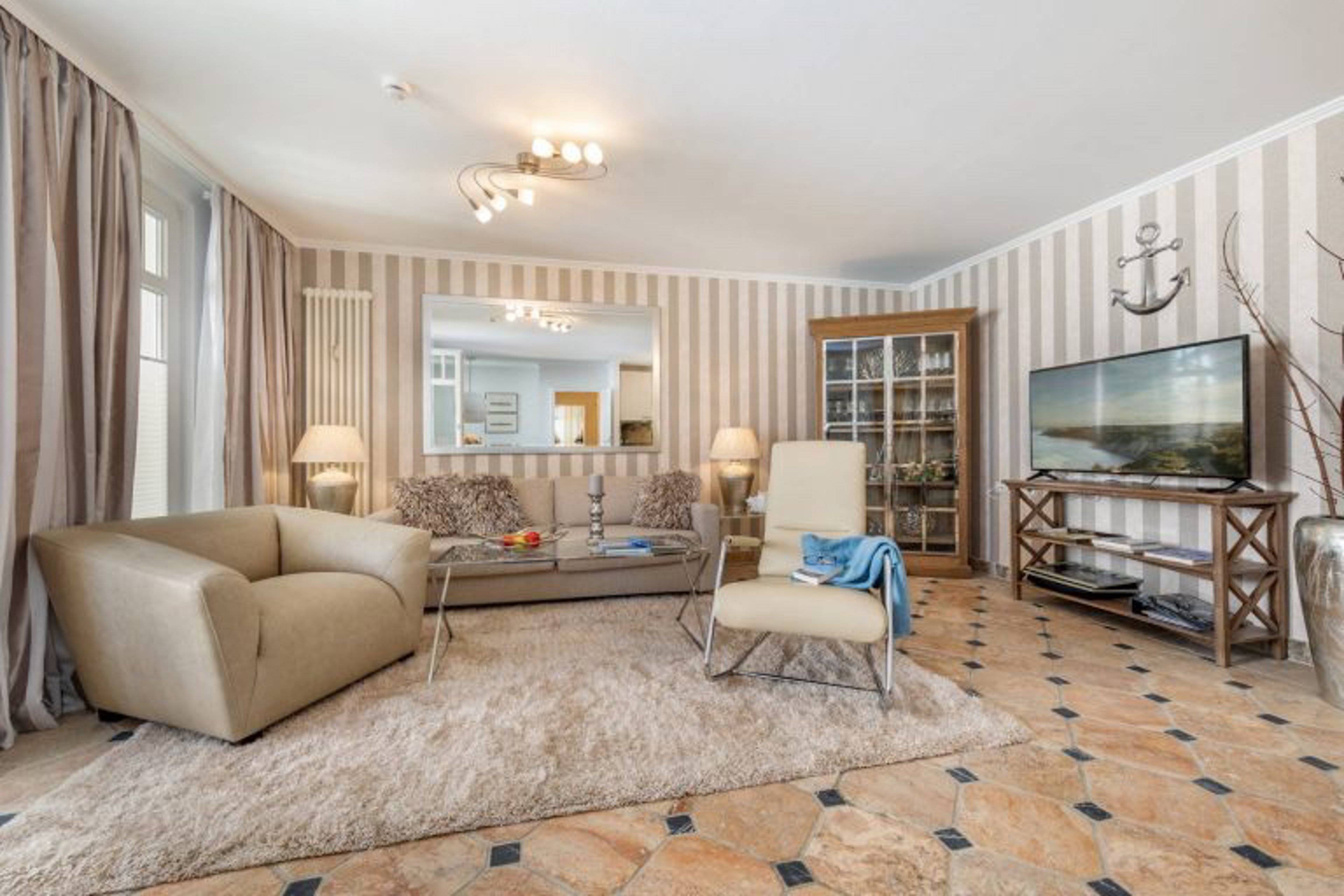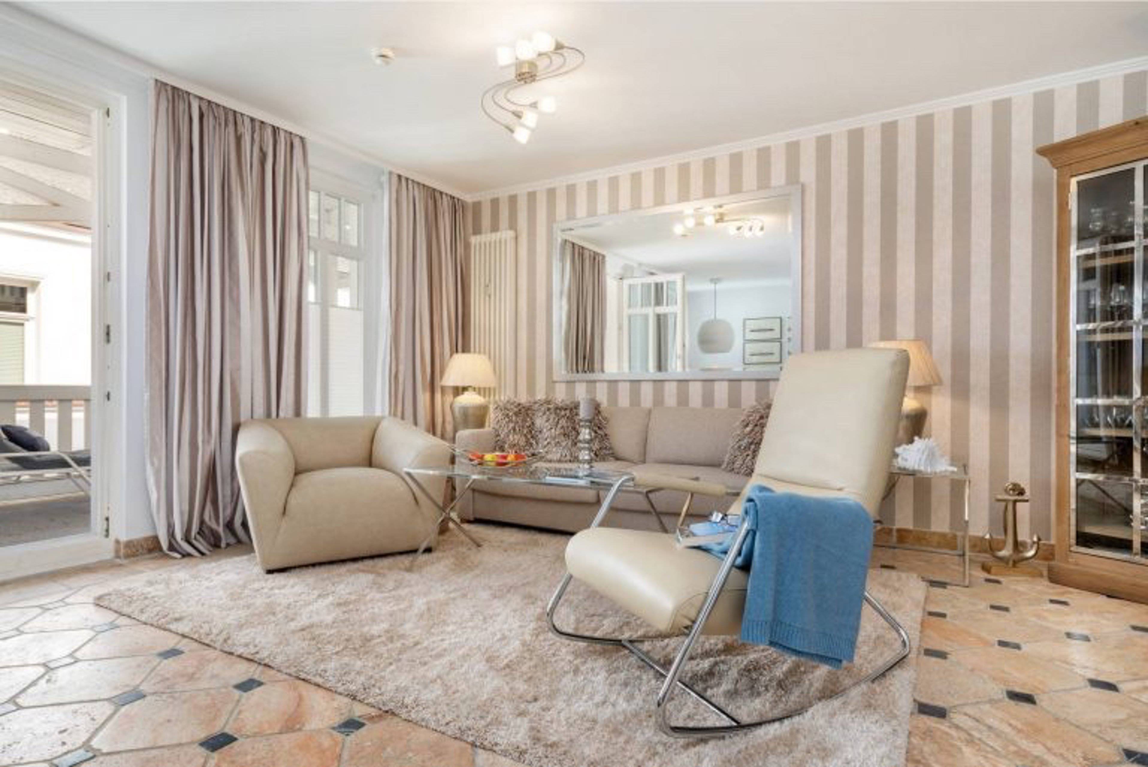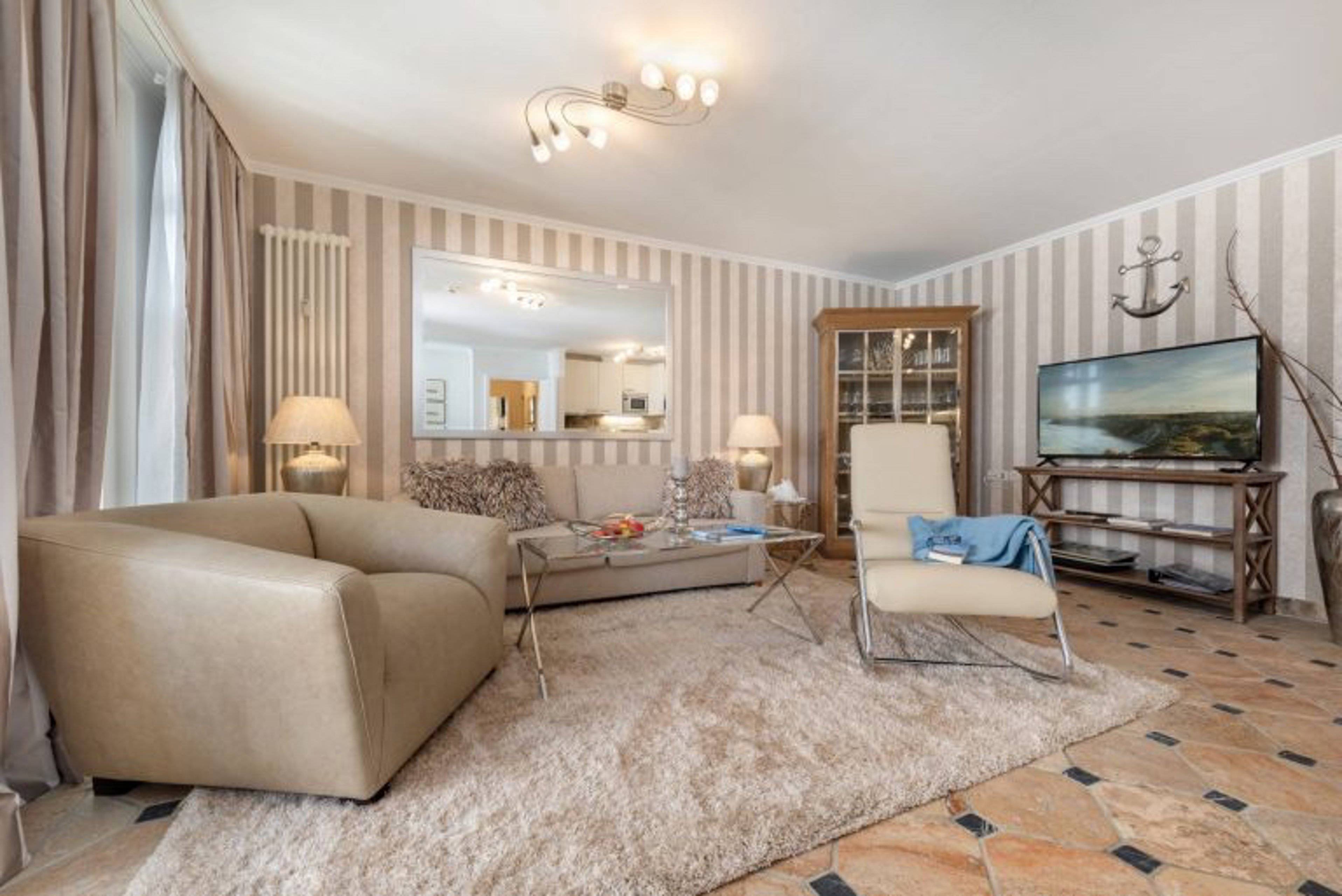 Über einen Aufzug gelangt man von der Tiefgarage direkt in das 2. Obergeschoss und in die Ferienwohnung Meereslust. Der Wohnbereich begeistert durch sein warmes, anspruchsvolles Ambiente, welches zudem durch Stil und Gemütlichkeit überzeugt.