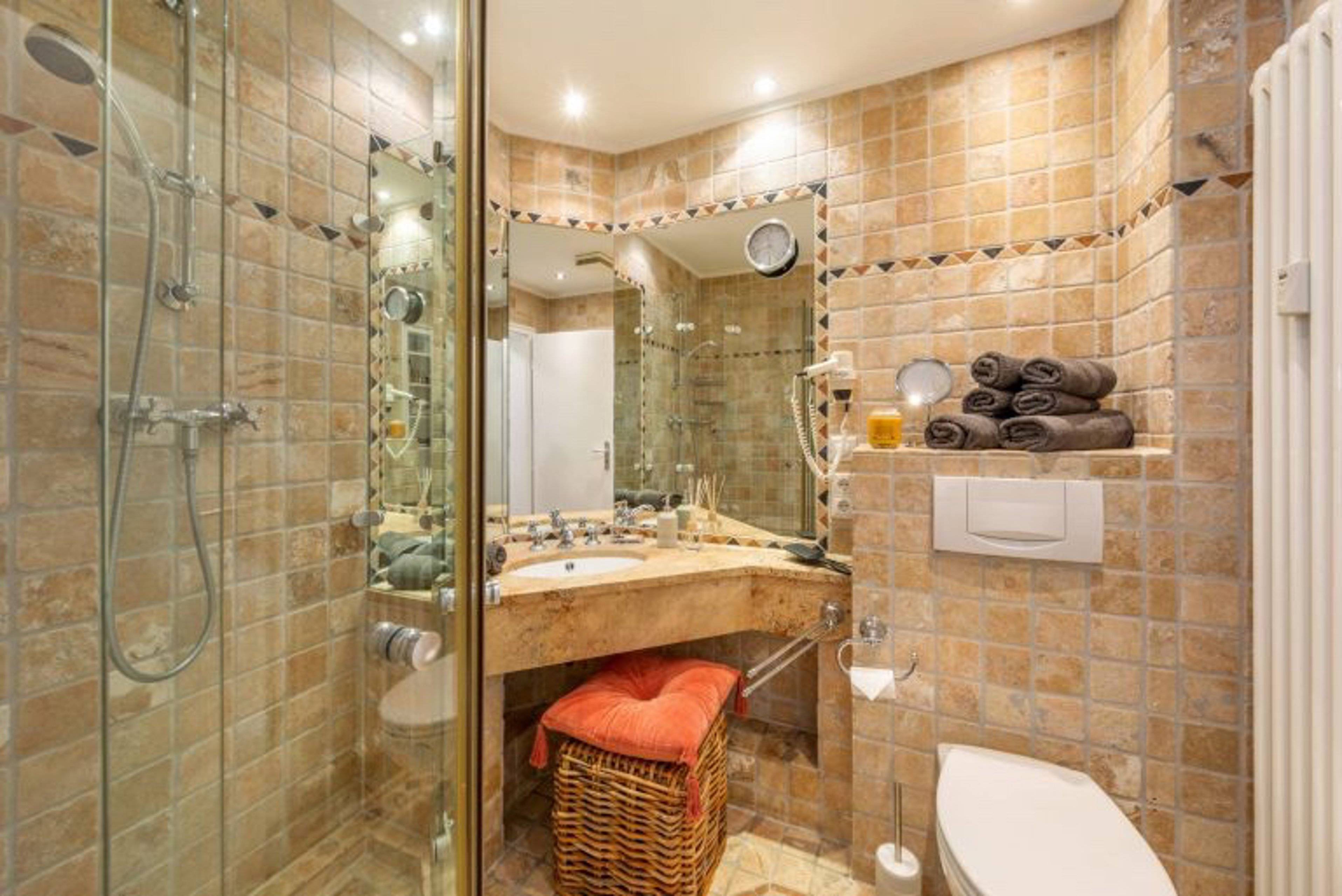 Dusche Haartrockner Heizung Kosmetikspiegel Spiegel Waschbecken WC