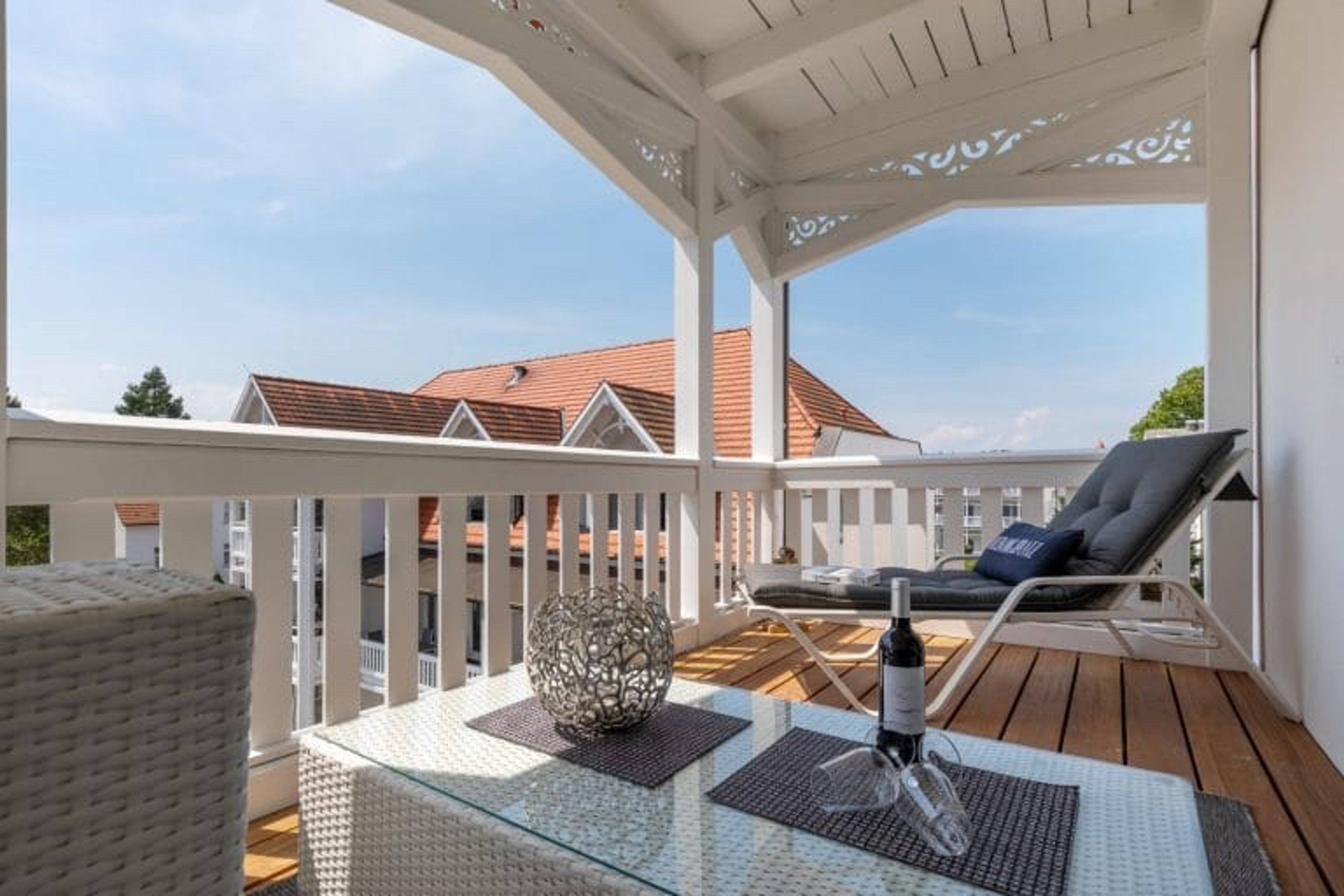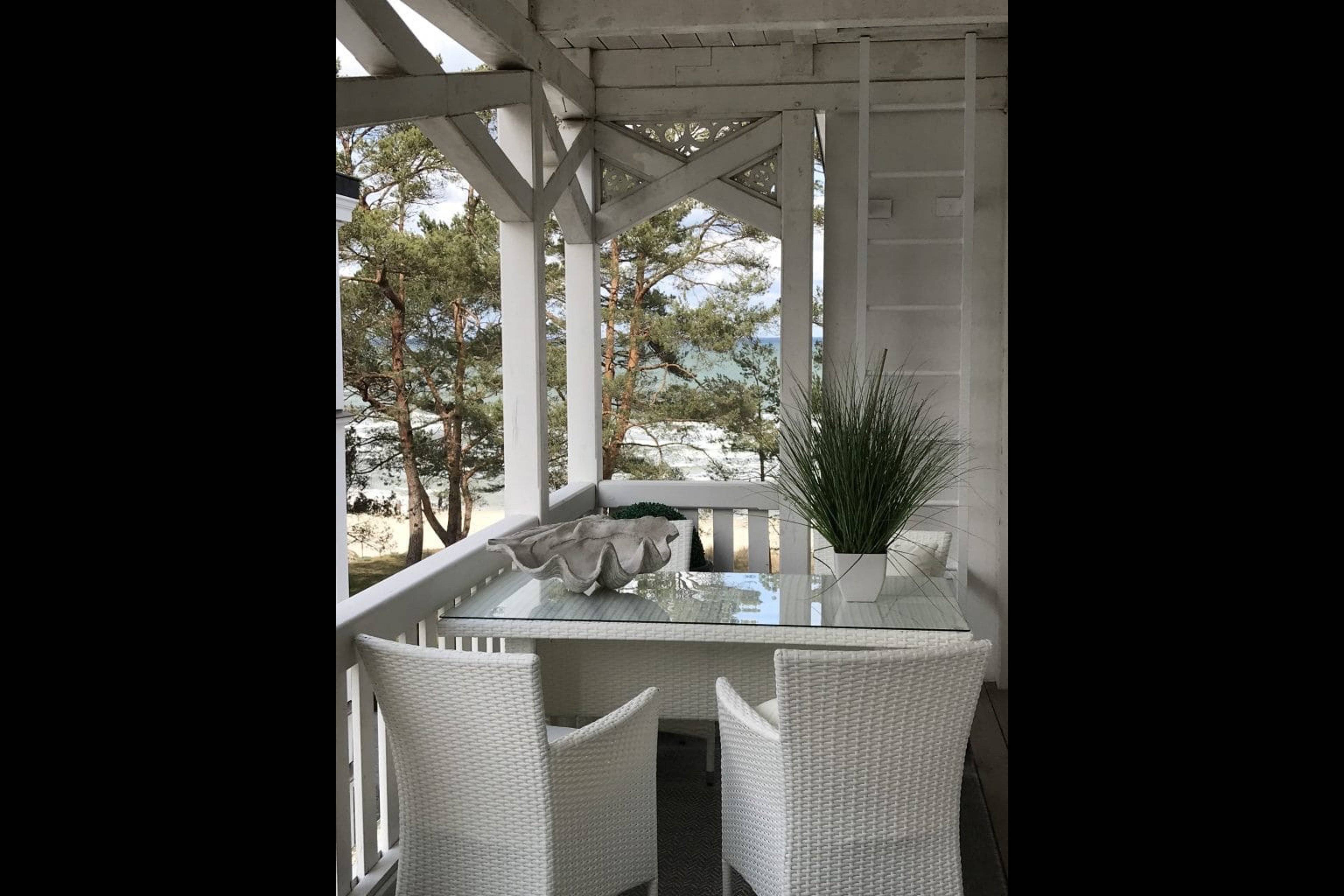 Balkon überdacht Gartenstühle Gartentisch Meerblick