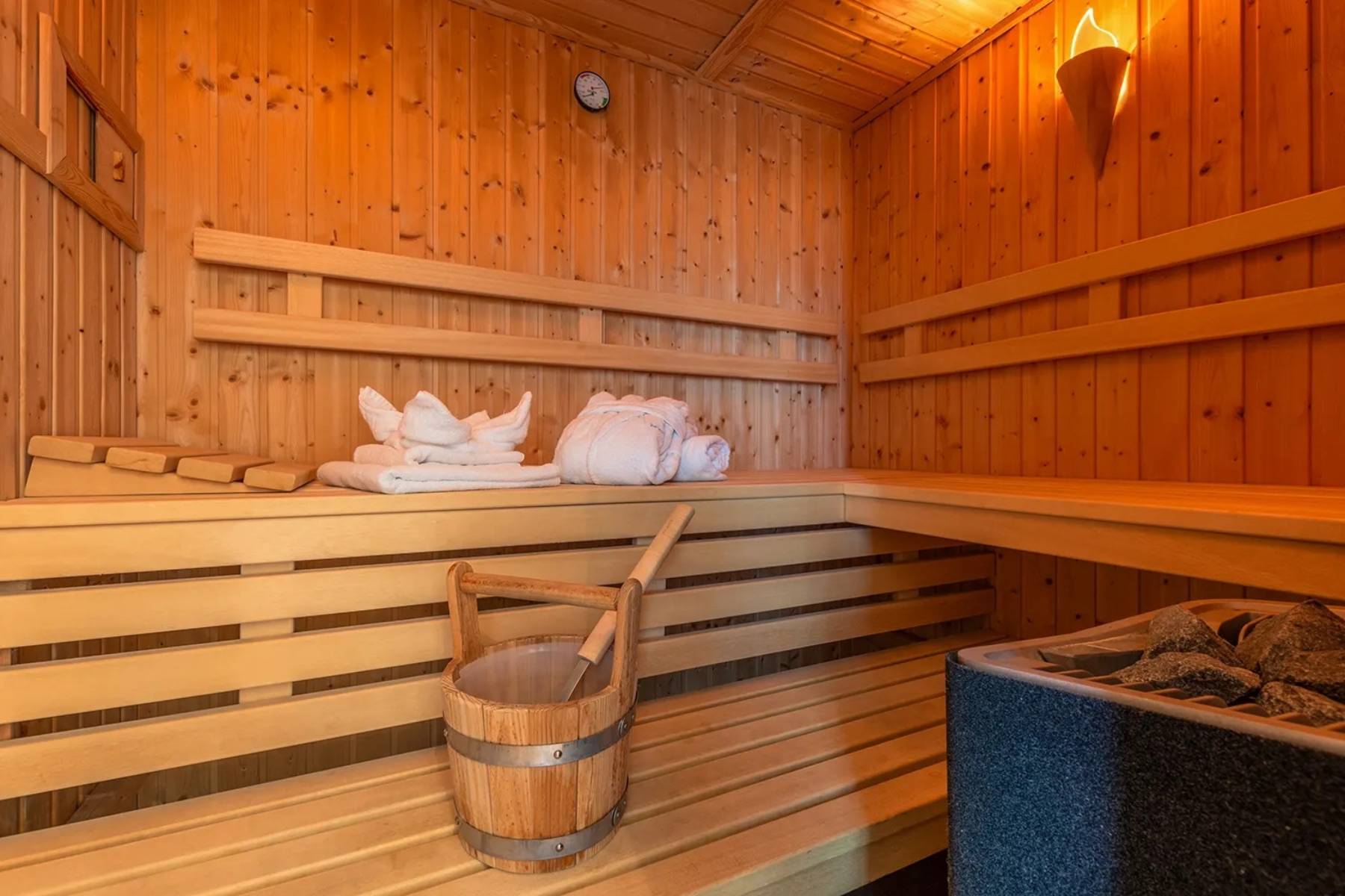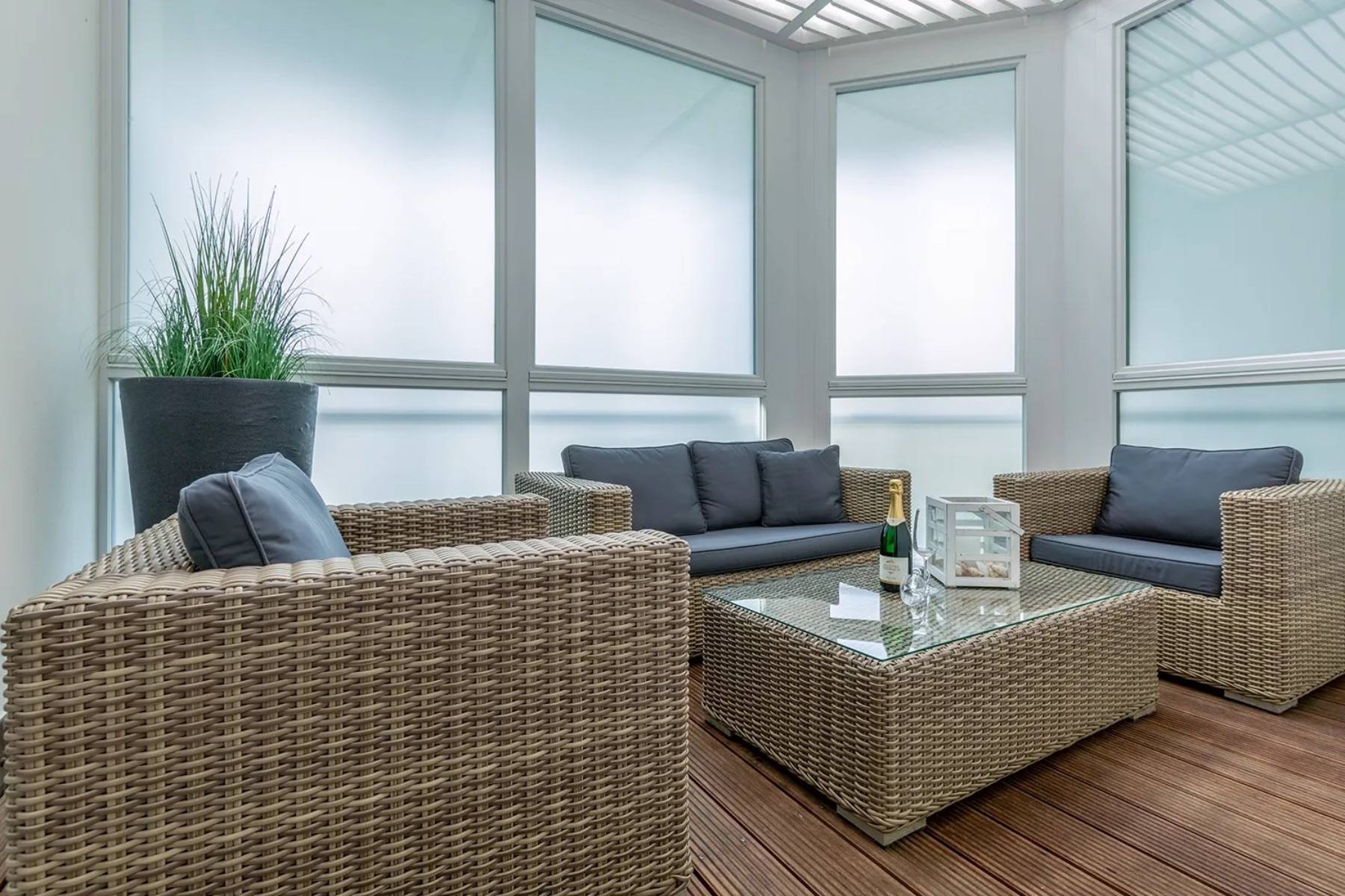 Die Ferienwohnung Ocean One ist mit zwei modernen Schlafzimmern ausgestattet, die jeweils über ein großes Doppelbett, einen Flachbildschirm und ebenso über einen Meerblick verfügen, die einen sprachlos machen. Ein Badezimmer en suite mit Badewanne und ein Badezimmer verfügt über eine Dusche und eine Sauna. Von hier gelangt man in ein Atrium, in dem Loungemöbel zum Relaxen platziert sind.