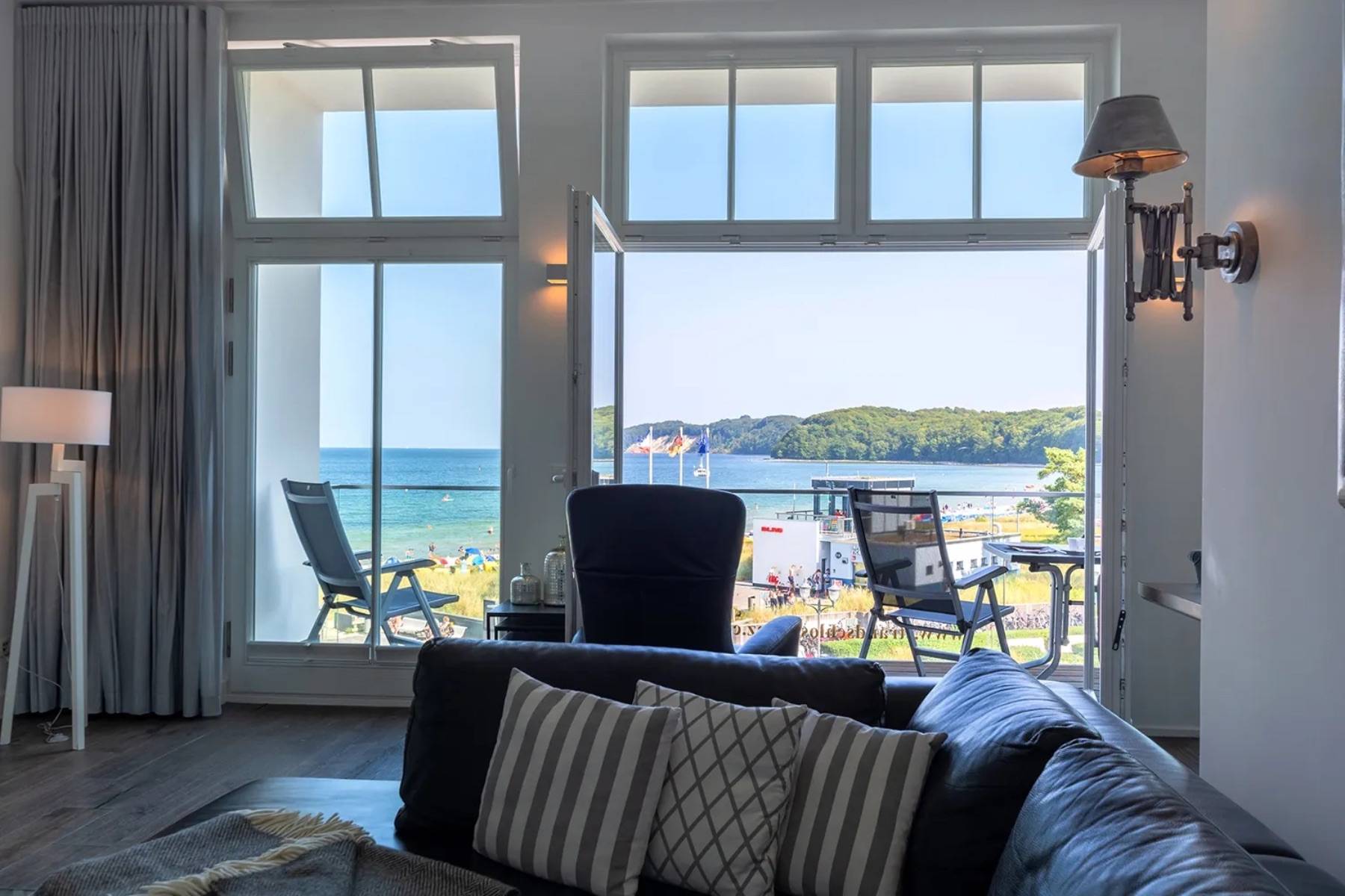 Balkonzugang Bücher Ecksofa Esstisch Fenster Flatscreen Fußbodenheizung Hifi- Anlage Kamin Meerblick Sessel Stühle Vorhänge