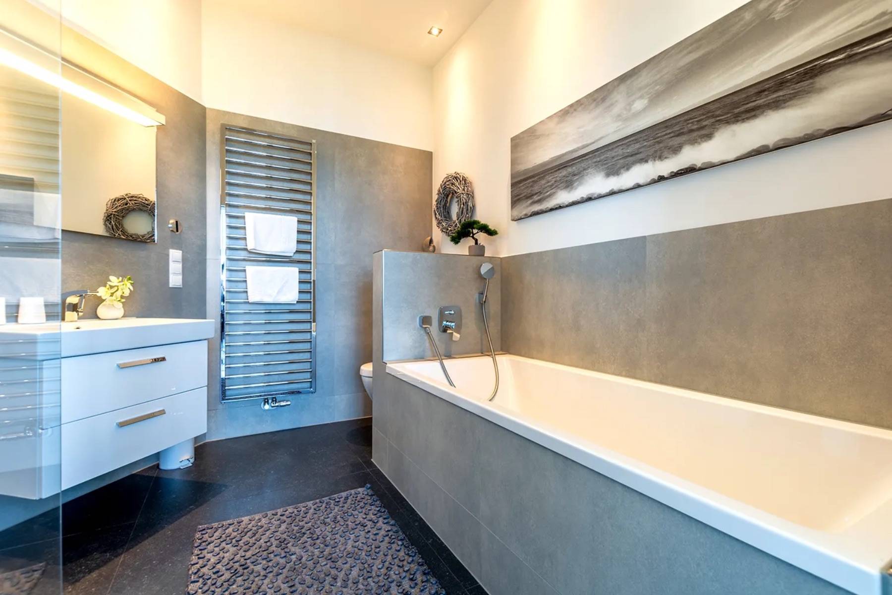 Badewanne Fußbodenheizung Haartrockner Handtuchheizkörper Spiegel Waschbecken WC