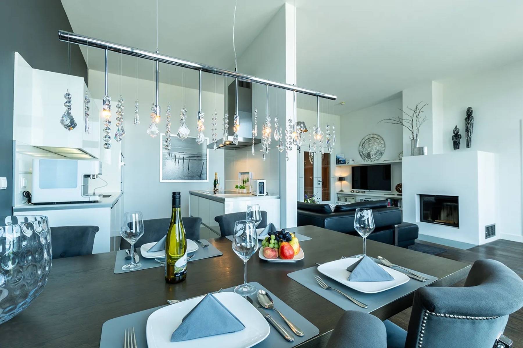 Mit dem Aufzug gelangt man von der Tiefgarage direkt in die zweite Etage, in der sich die 110 qm große Ferienwohnung befindet, die im modernen Loft- Style eingerichtet ist.