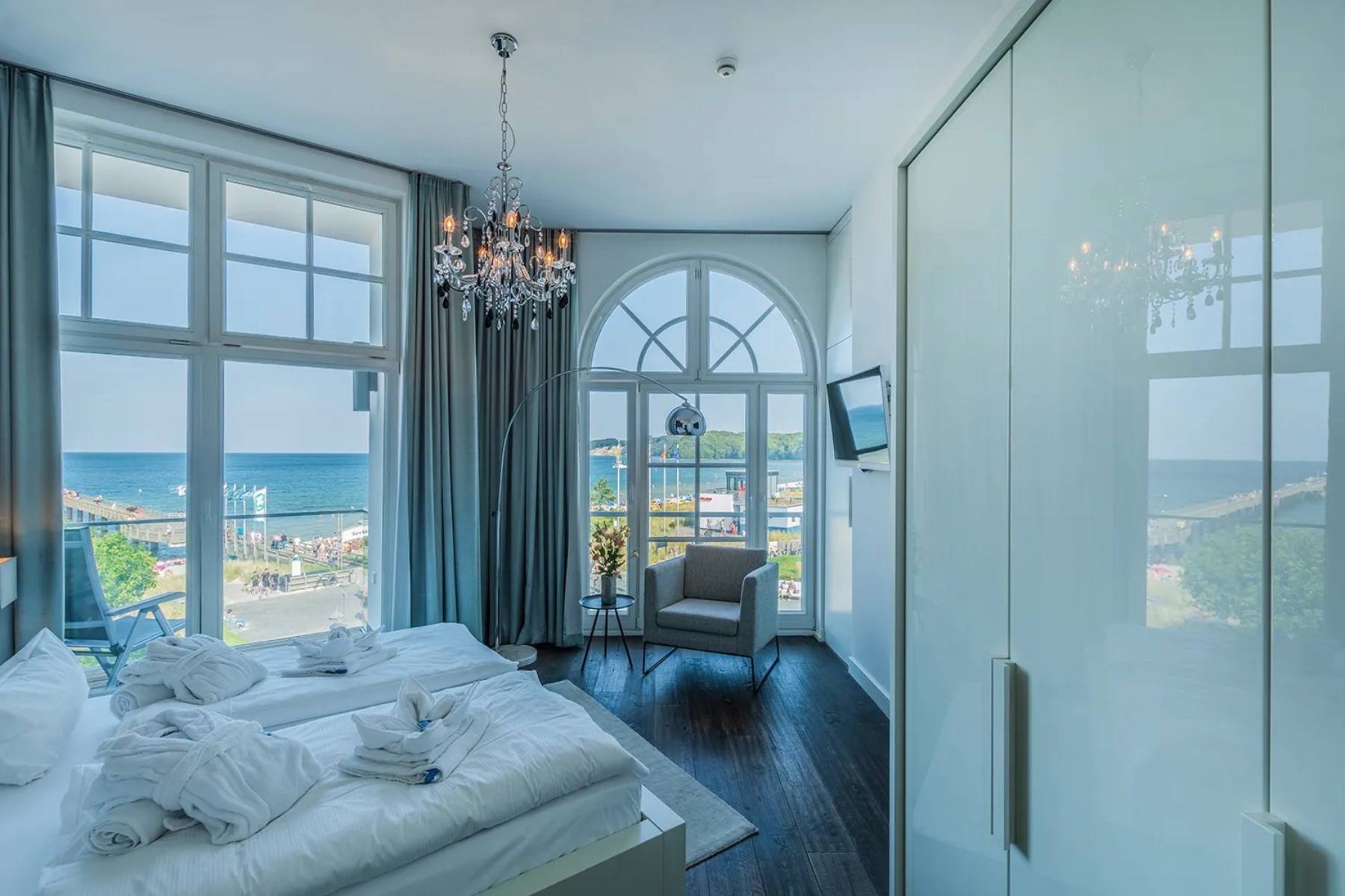 Doppelbett Fenster Flatscreen Fußbodenheizung Kleiderschrank Meerblick Stuhl Vorhänge