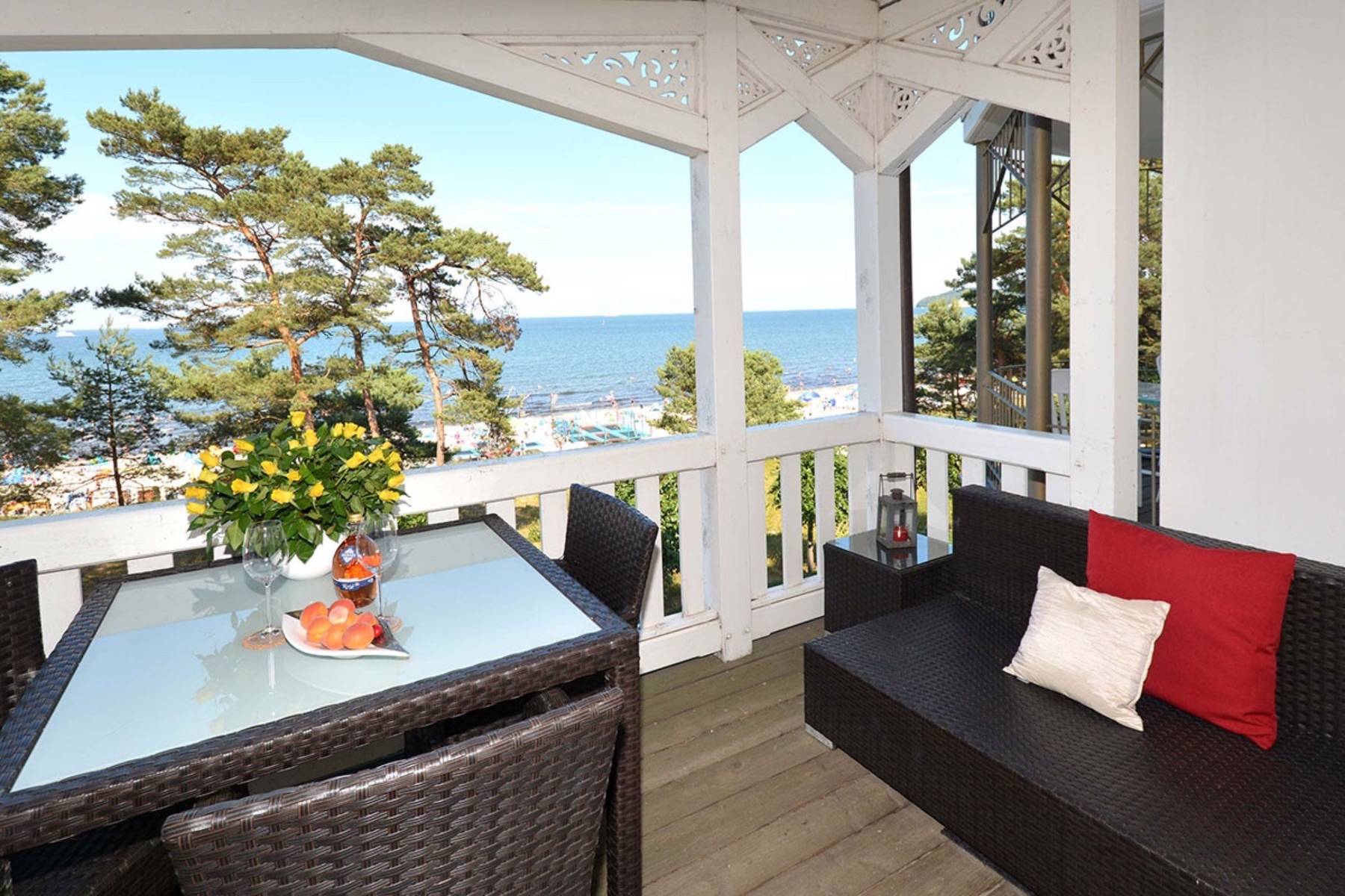 Der Balkon ist komplett überdacht und mit Gartenstühlen und einem Tisch bestückt. Der Ausblick auf die Strandpromenade, den Badestrand und das Meer ist faszinierend.