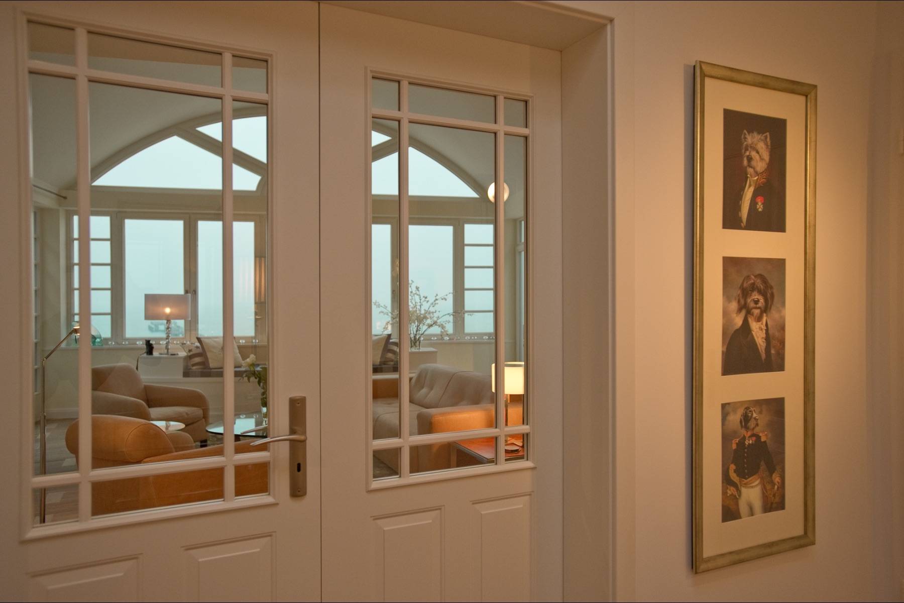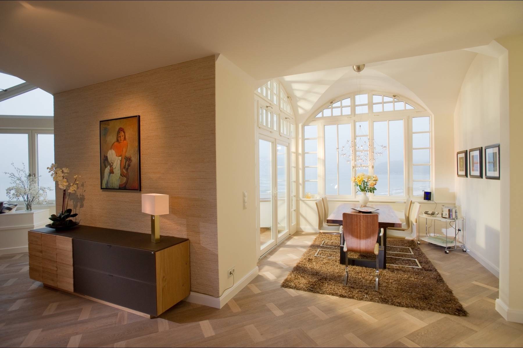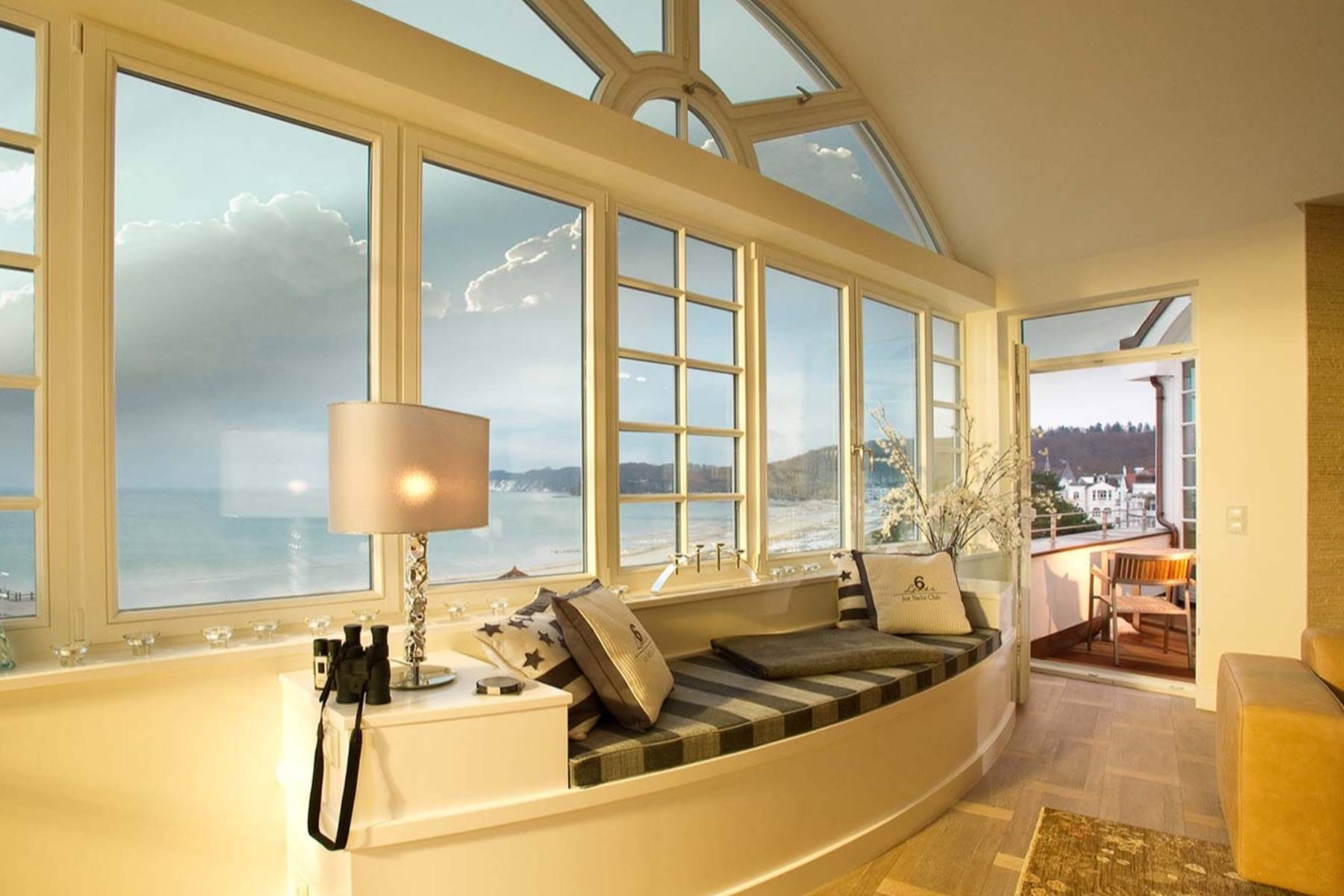 Das Wohnzimmer mit einer Raumhöhe von bis zu vier Metern ist in der gesamten Breite mit einer Fensterfront versehen, die den Raum mit ausreichend Tageslicht durchflutet und einen phänomenalen Ausblick gewährt. Der freie Blick reicht dabei über die gesamte Binzer Bucht bis hin zu den Kreidefelsen. Selbst aus einem der beiden Schlafzimmer können Sie die Sonnenaufgänge in aller Ruhe genießen.