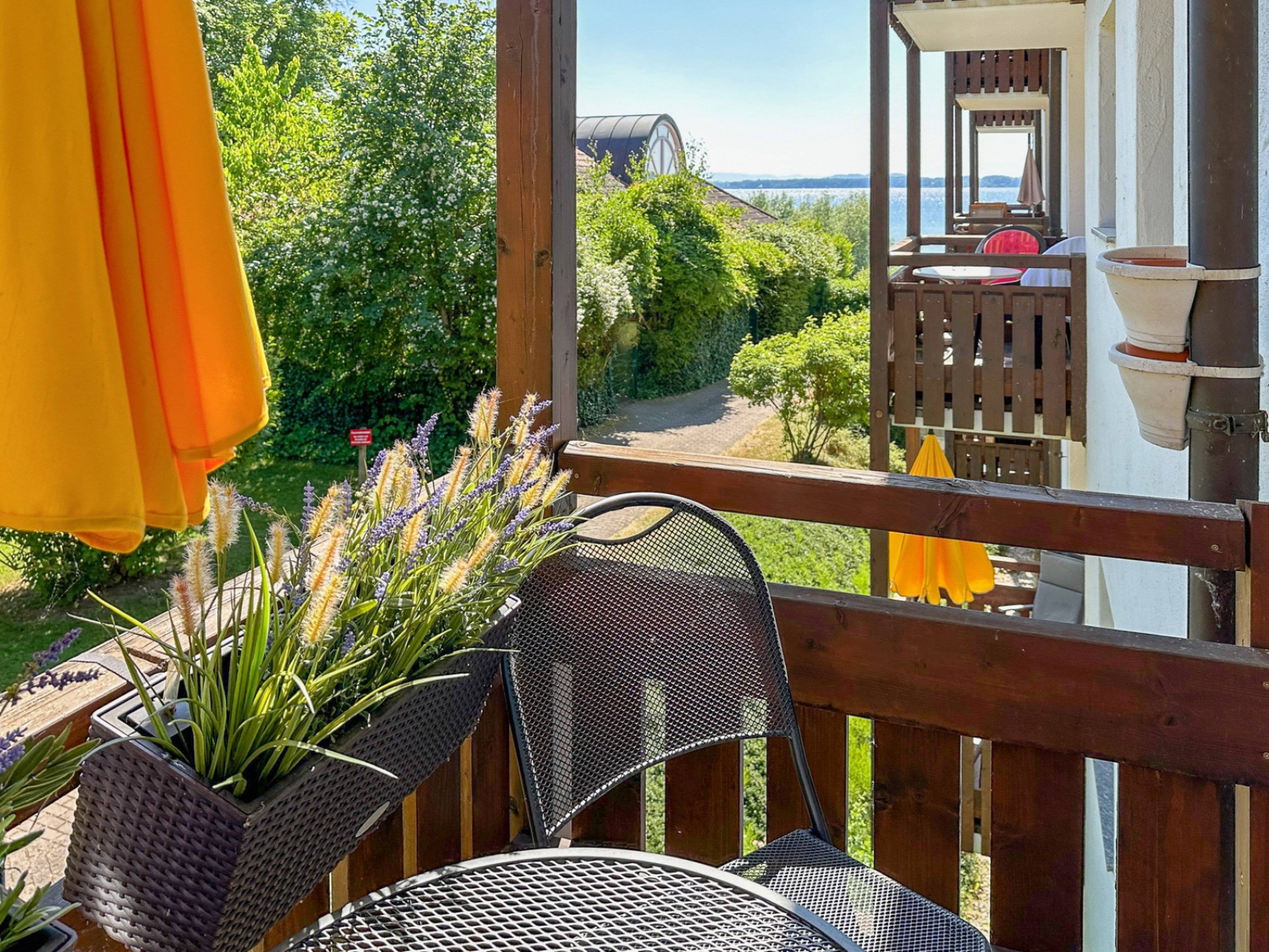 Die Wohnung verfügt über ein separates Schlafzimmer mit Doppelbett sowie einen offenen Wohn- und Essbereich mit Schlafgelegenheit. Das moderne Bad rundet den Wohnkomfort ab. Der möblierte Balkon lädt zu entspannten Momenten mit Blick auf den Chiemsee ein – sei es morgens mit Kaffee oder abends beim Sonnenuntergang.
