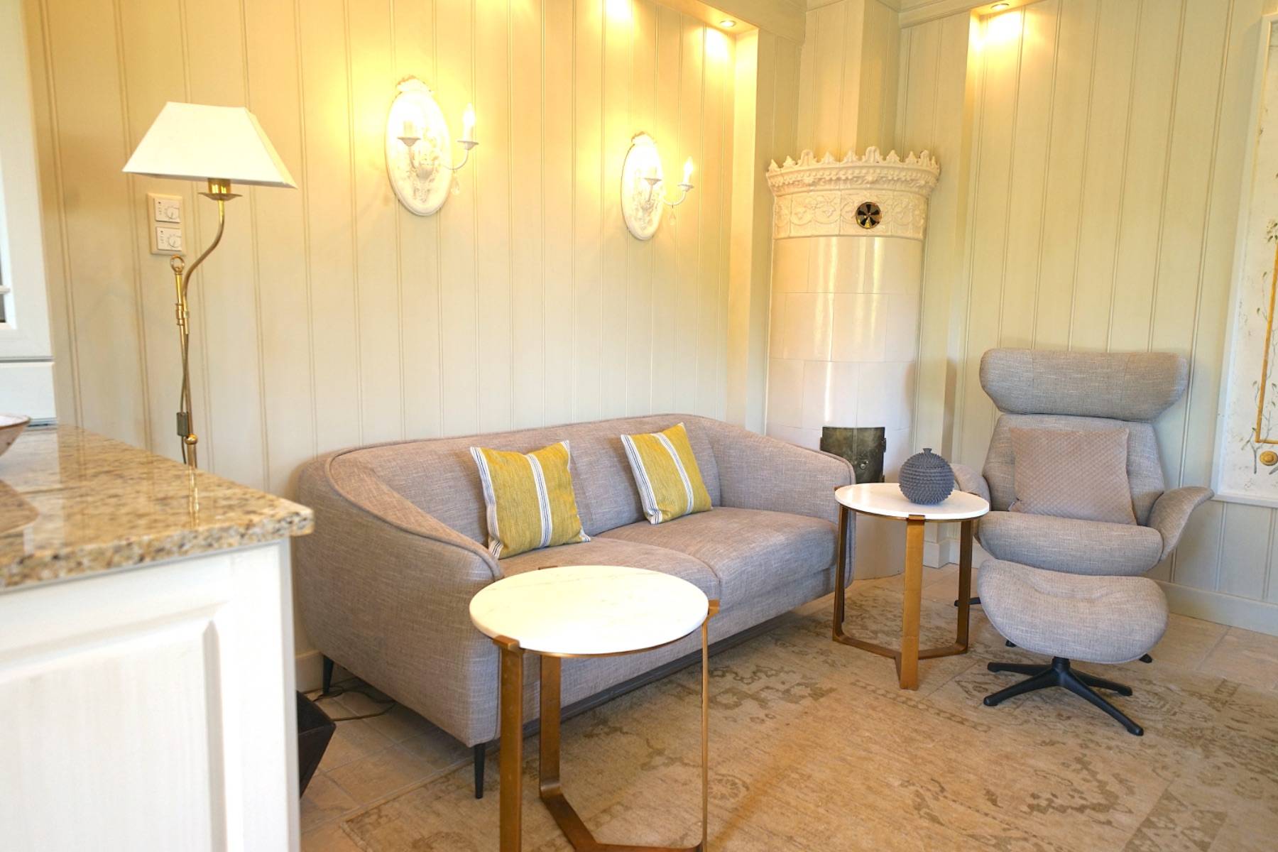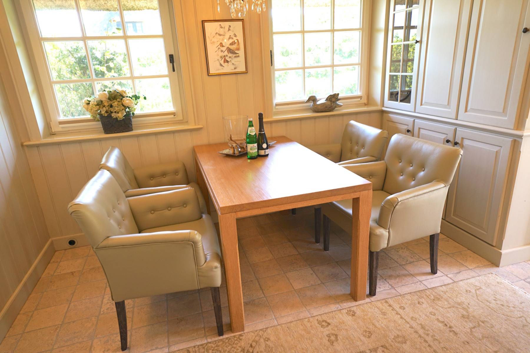 Der Fußboden in dem exklusiven Ferienhaus Watthoog in Kampen ist mit modernem Marmor in Antikoptik verlegt und unterstreicht das edle Ambiente. Ein weiterer Blickfang ist ein klassisch Sylter Mylin Kaminofen und ein großer Esstisch mit modernen und bequemen Polstersesseln.