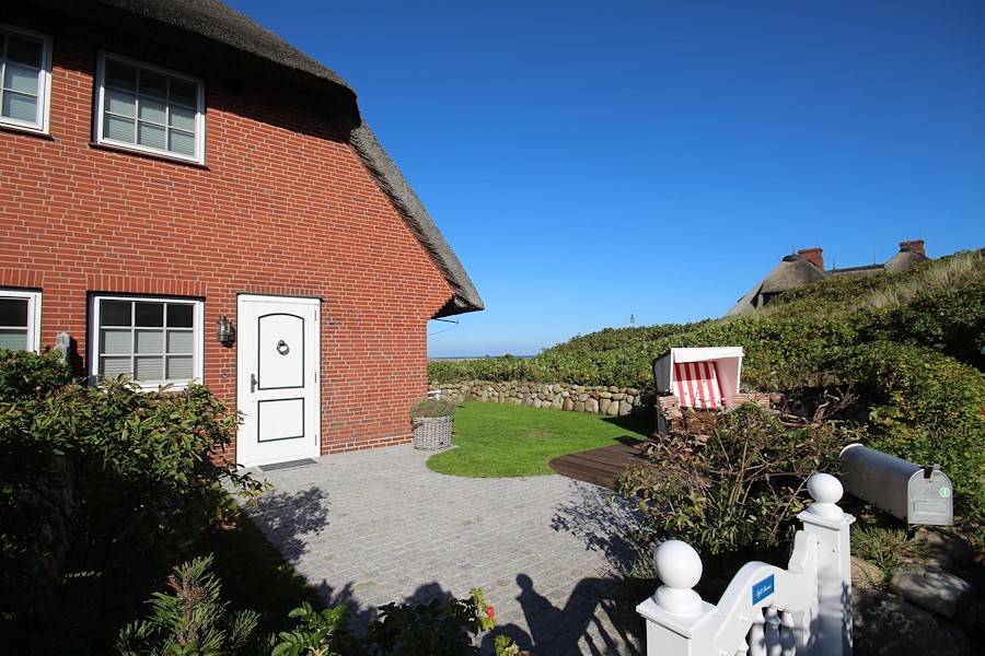 Der Garten ist mit einem Steinwall und hohen Sylter Rosenhecken vollständig umrahmt, wodurch im Sommer die Privatsphäre geschützt bleibt. Zudem können sich Kleinkinder und Haustiere frei im Garten bewegen, in dem ein Strandkorb und exklusive Gartenmöbel von Garpa zum relaxen einladen. Meerblick inklusive,