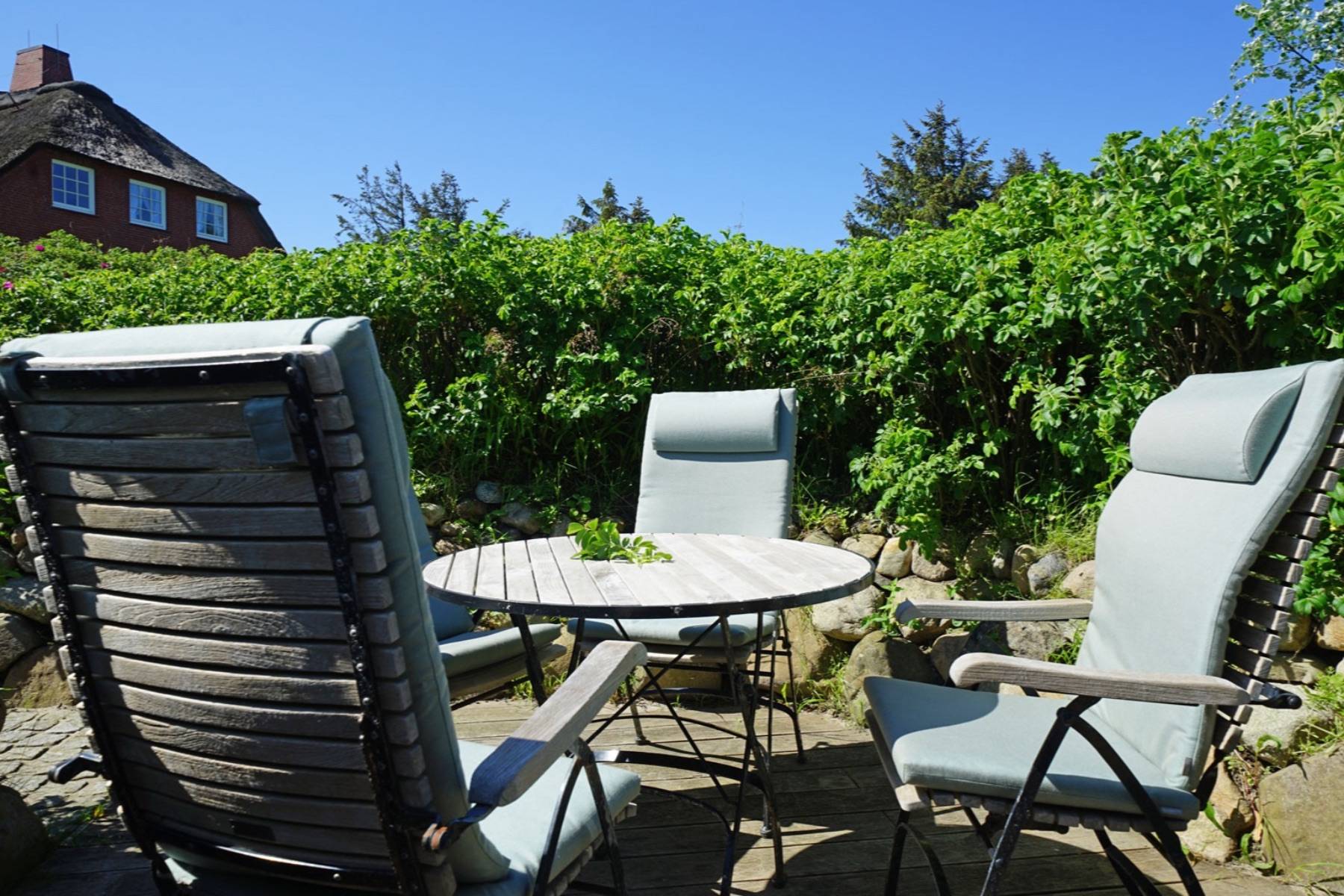Genießen Sie einmalige Momente auf der Terrasse, auf der ein Strandkorb und exklusive Gartenmöbel von Garpa auf Sie warten. Umgeben von Sylter Wildrosen wird Ihnen das Sylter Flair in ewiger Erinnerung bleiben. Ein idealer Ort für bis zu vier Personen, gleich ob zwei Paare oder für die gesamte Familie. Freuen Sie sich auf einen traumhaften Urlaub in Kampen auf Sylt.
