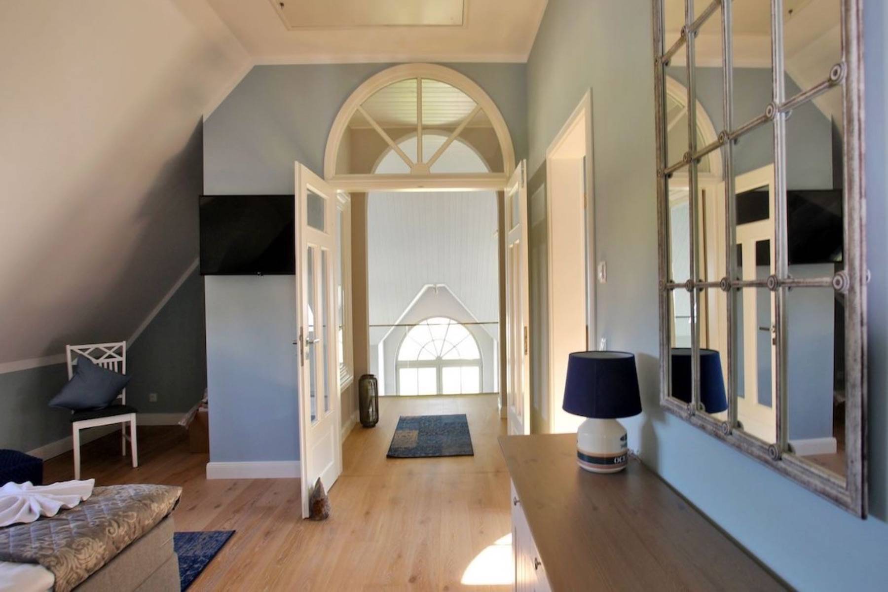 Der Wohnbereich begeistert durch die überdurchschnittlich hohen Räume, ein gemütliches Ambiente und die zahlreichen Sprossenfenster, aus denen man direkt auf das Meer blicken kann. Dieses hat man auch aus der exklusiven Küche mit Küchentheke stets im Blick. Komfortable Polstermöbel, die mit geschmeidigen Samt bezogen sind, laden zum Verweilen, oder einem Fernsehabend ein.