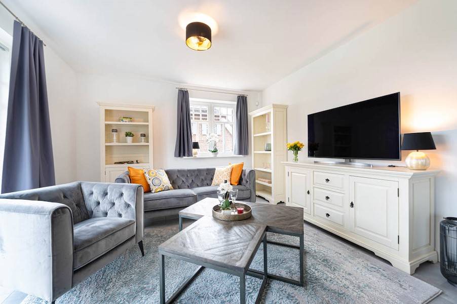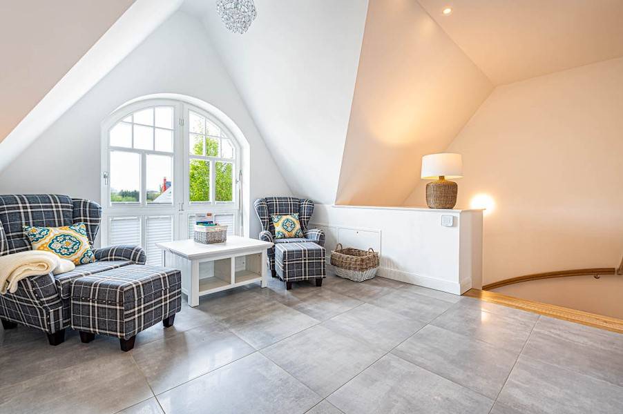 Im Obergeschoss beherbergt das etwa 220 qm große Ferienhaus drei Schlafzimmer, die allesamt mit einem Flachbildschirm versehen sind. Zwei moderne und helle Badezimmer – davon eines mit Badewanne und Dusche – garantieren ausreichend Privatsphäre.