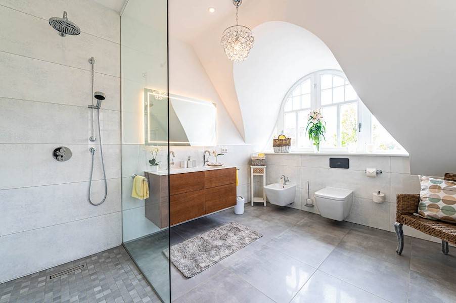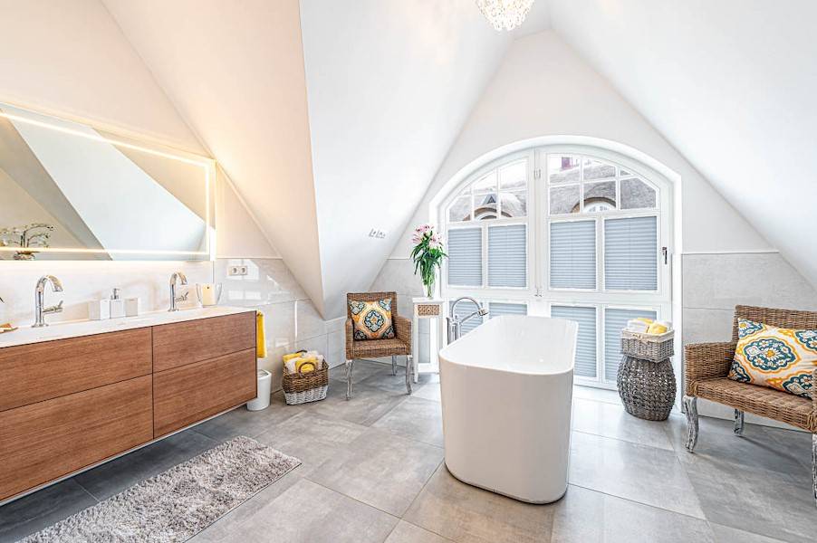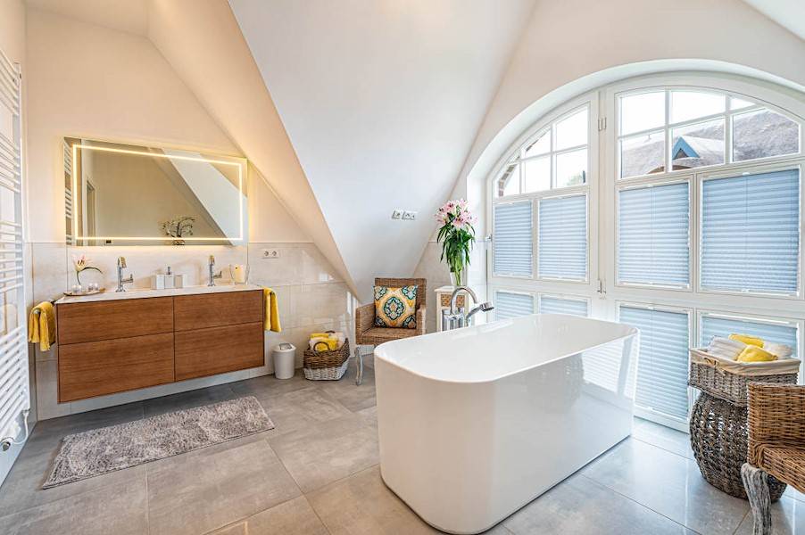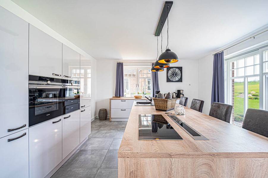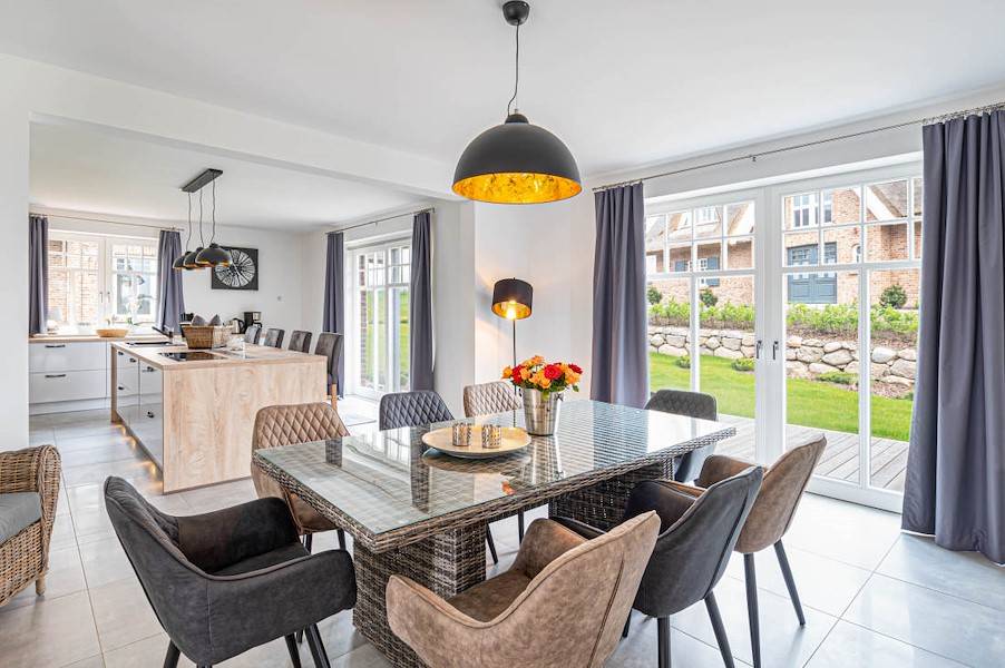 Das Ferienhaus Düne besticht durch einen großzügigen Wohn- Ess- und Kochbereich, der sich über das gesamte Erdgeschoss erstreckt. In dem edlen Badezimmer auf dieser Ebene lässt es sich in der Sauna im Chaletstil vorzüglich entspannen.