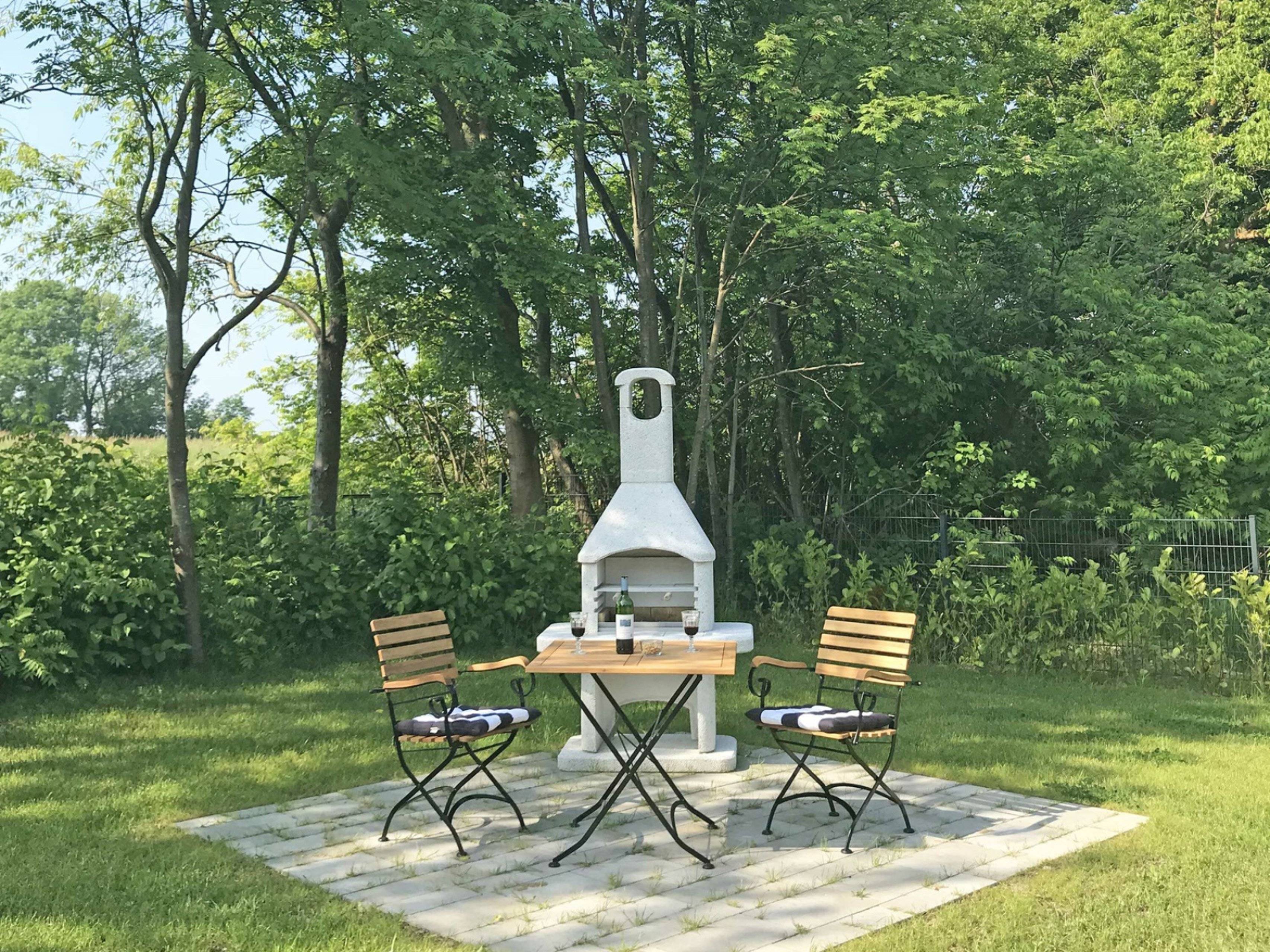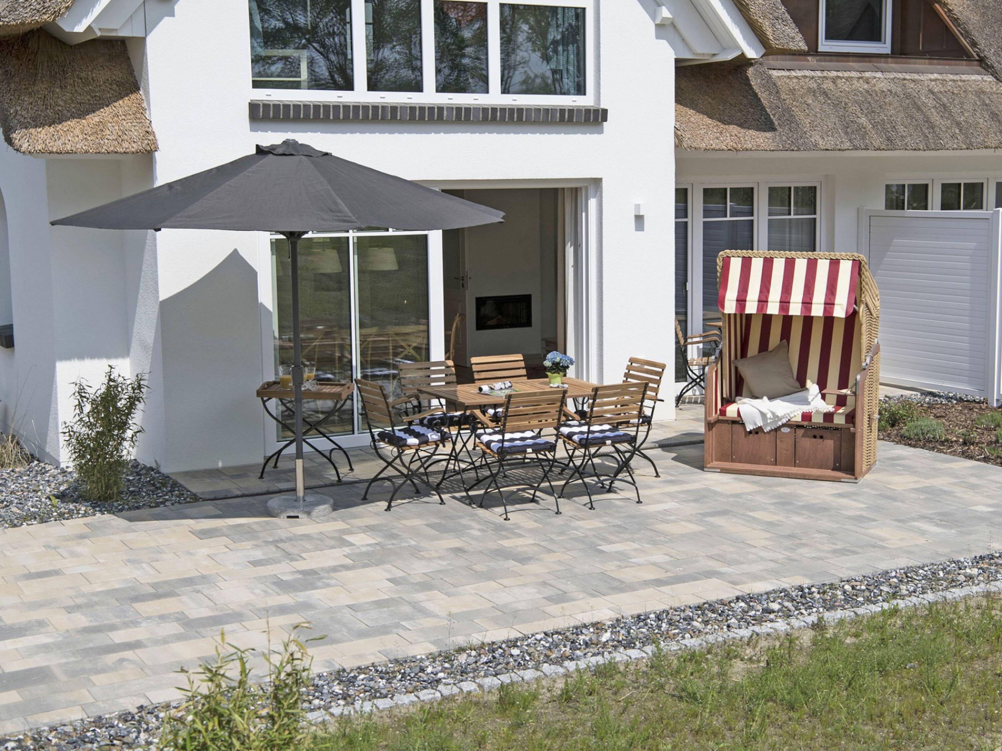Die großzügige eigene Terrasse ist nach Süden ausgerichtet. Entspannen Sie im komfortablen Strandkorb und genießen Sie den herrlichen Blick auf den gemeinschaftlich nutzbaren Garten und auf das dahinterliegende Naturschutzgebiet. Die Terrasse ist weiterhin mit einem Sonnenschirm, einem großen (130x80 cm) und einem kleinen Terrassenholztisch (80x80 cm) mit passenden Stühlen bestens ausgestattet.