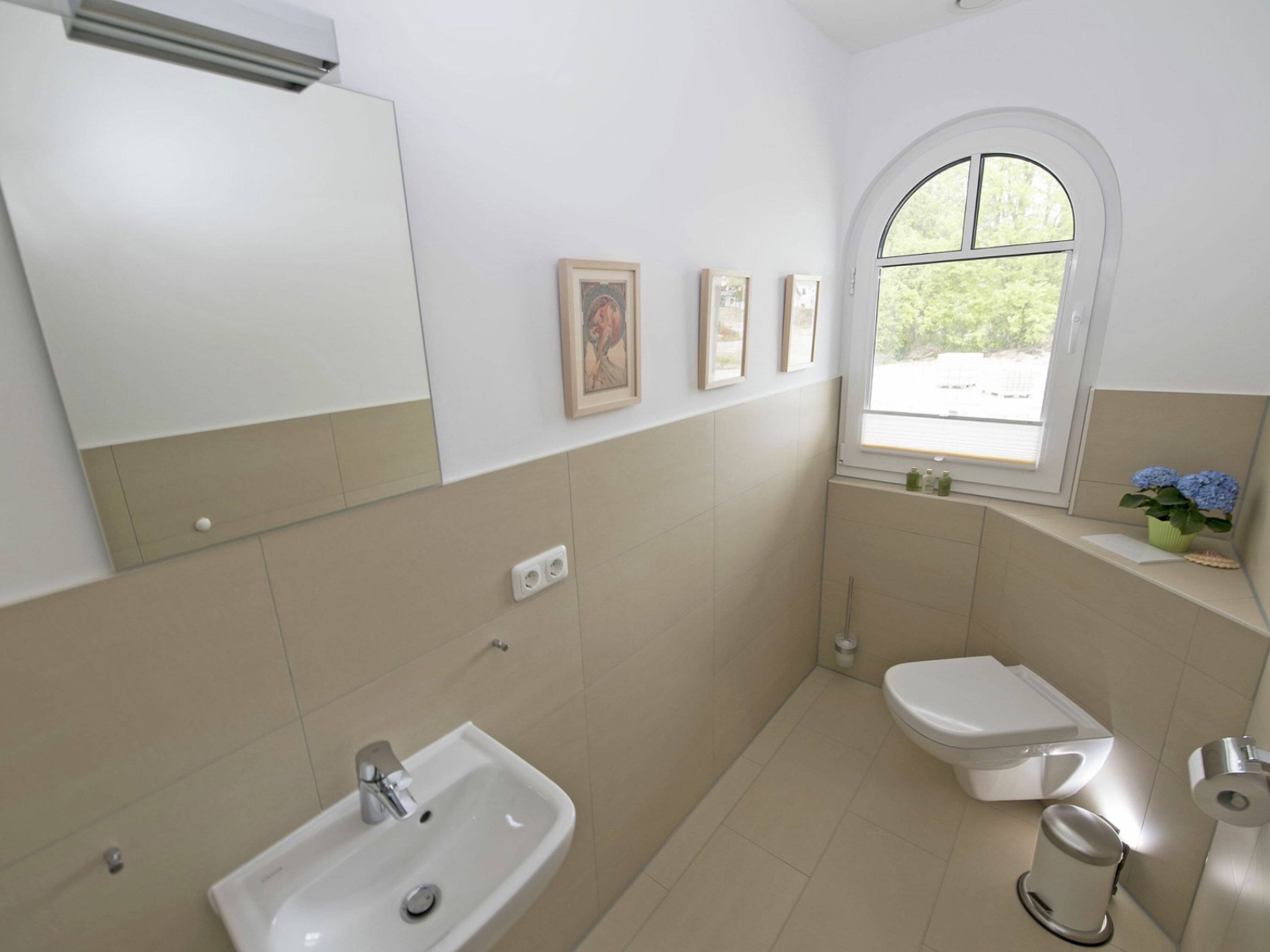 Im Erdgeschoss befinden sich ebenfalls ein modernes Duschbad mit einer eigenen Sauna, ein Gäste-WC, ein Hauswirtschaftsraum mit einer Waschmaschine und einem Trockner und ein Abstellraum mit Haushalts- und Bügelutensilien. Im gesamten Erdgeschoss befindet sich eine Fußbodenheizung.