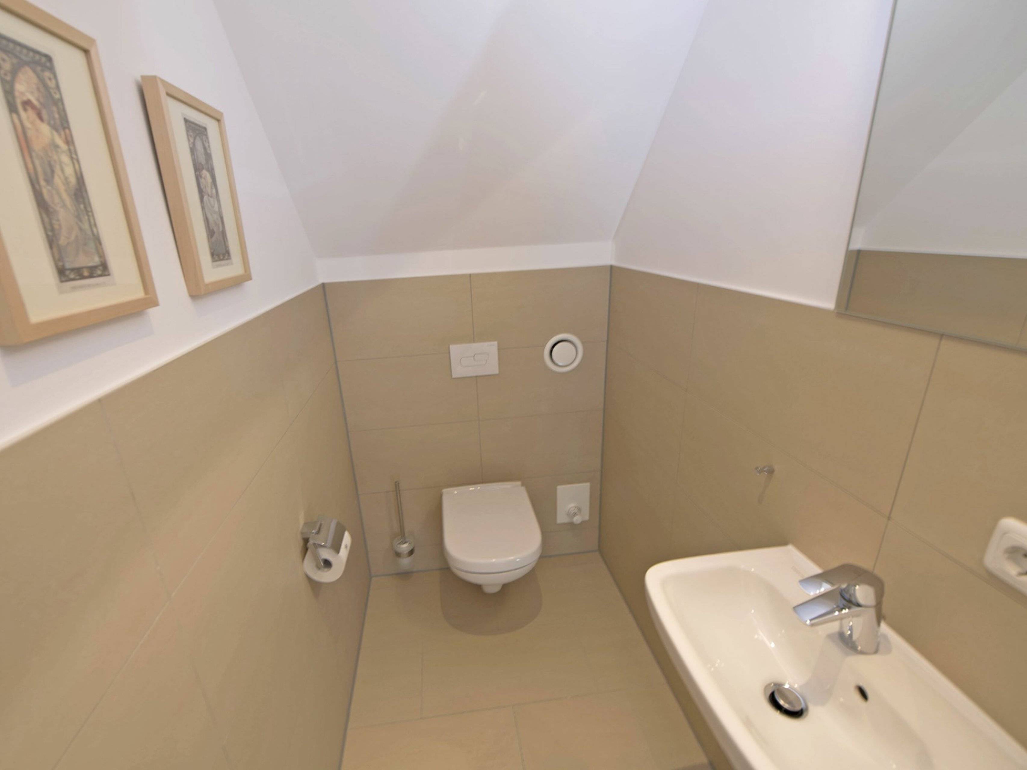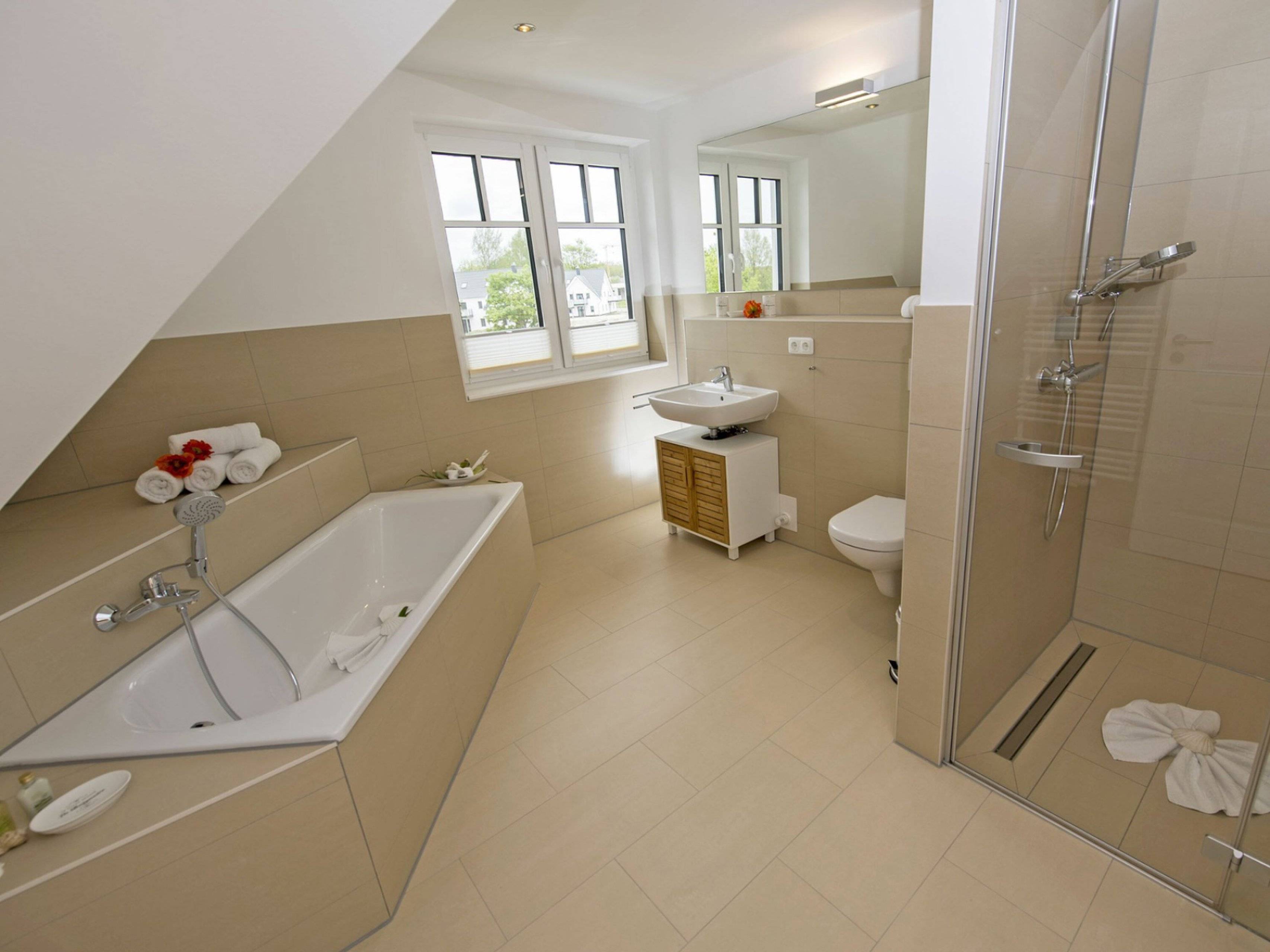 Im Obergeschoß des Hauses erwarten Sie 3 Schlafzimmer. Eines der Schlafzimmer verfügt über ein Doppelbett (140x200 cm) mit durchgehender Matratze. In den anderen beiden Schlafzimmern befindet sich je ein Doppelbett (180x200 cm) mit zwei einzelnen Matratzen. Ein Flachbild-TV finden Sie in einem der größeren Schlafzimmer. Alle Schlafräume können verdunkelt werden. Auf dieser Ebene befinden sich auch ein geräumiges Bad mit Dusche, Badewanne, WC, Handtuchtrockner und Fön sowie ein weiteres Gäste-WC.